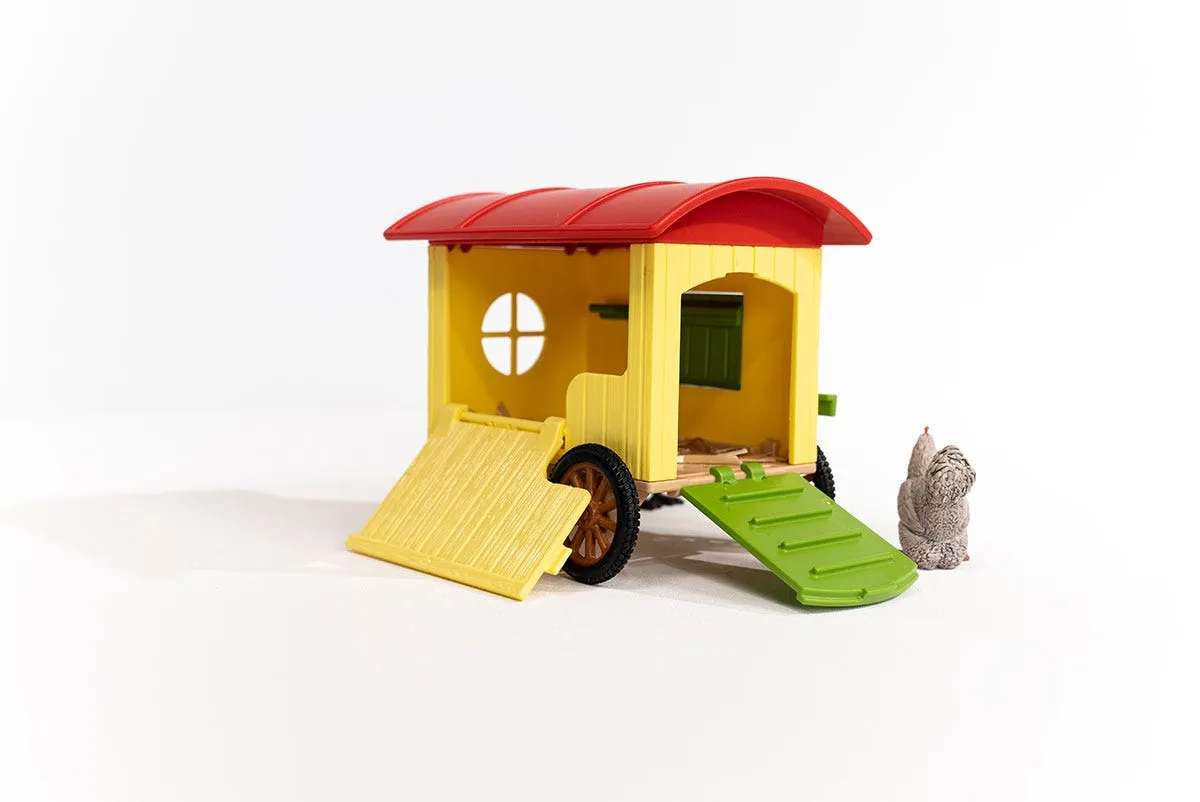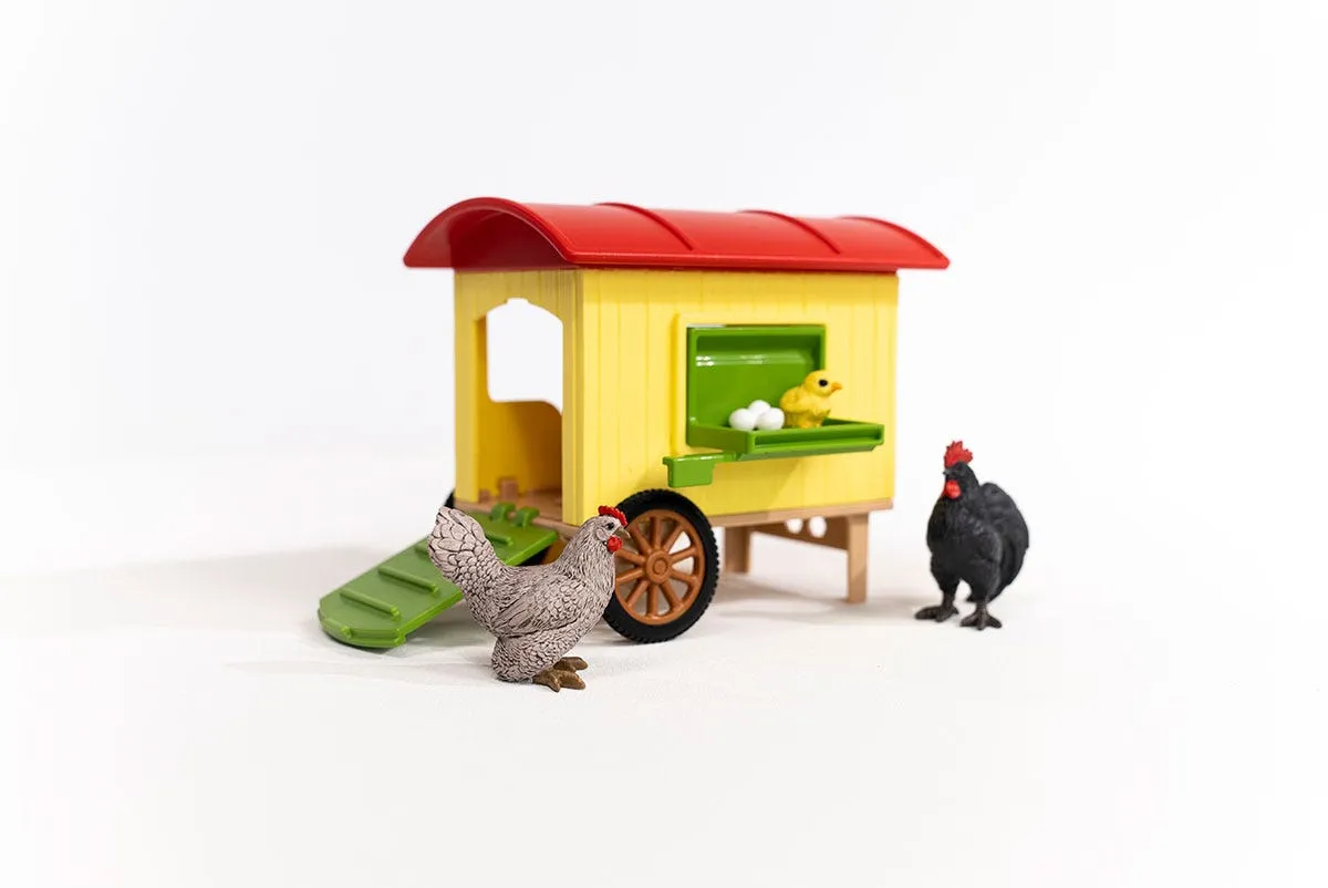 - 1x mobile chicken coop with side swing door, stowaway ramp and brooding box, 1x rooster, 1x hen, 1x chick, 1x eggs