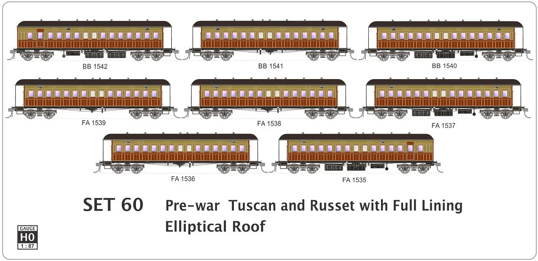 SDS Model HO NSWGR End Platform Car SET 60 Pre-War Tuscan & Russet - Full Lining 8 Carriage Pack