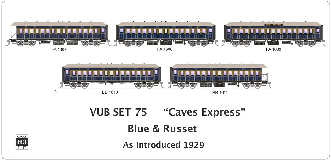 SDS Model HO NSWGR End Platform Car SET 75 "Caves Express" Blue & Russet 5 Carriage Pack