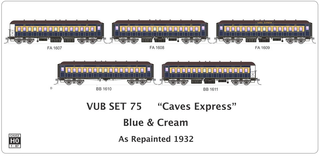 SDS Model HO NSWGR End Platform Car SET 75 "Caves Express" Blue & Cream 5 Carriage Pack