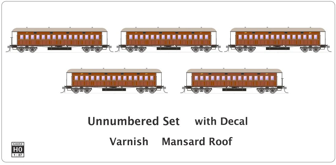 SDS Model HO NSWGR End Platform Car Varnish Unumbered Set Mansard Roof with Decal 5 Carriage Pack