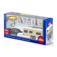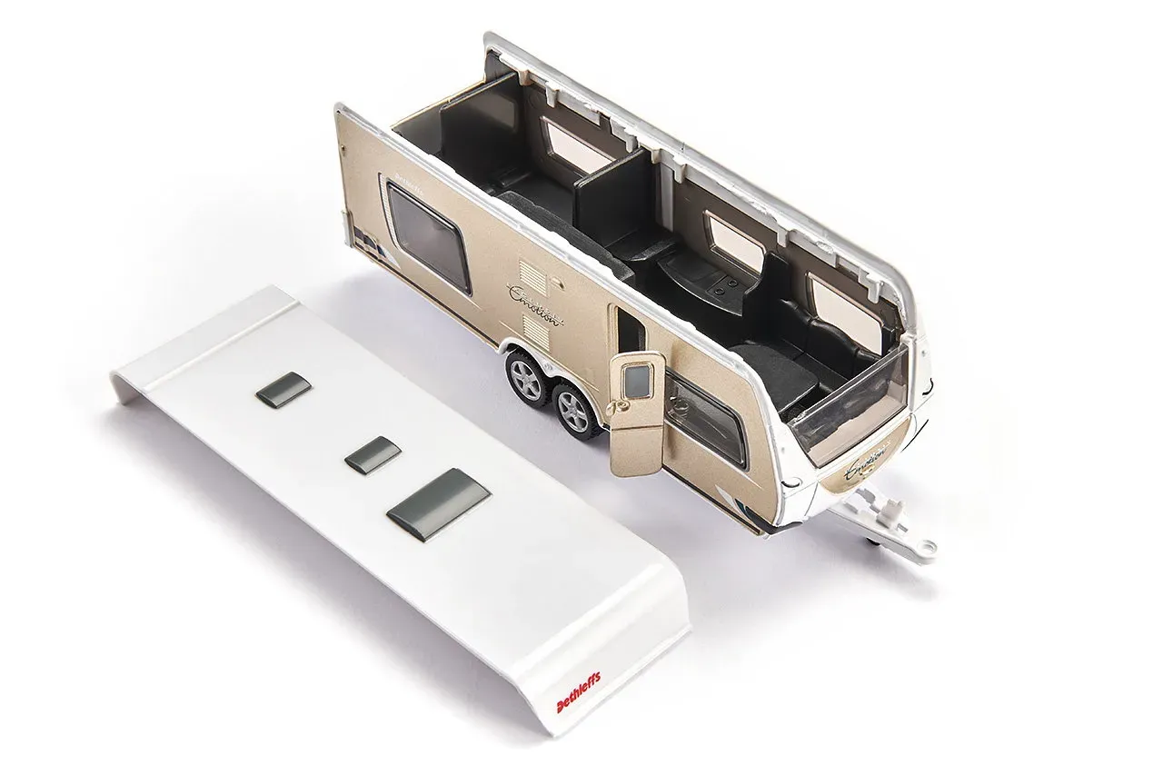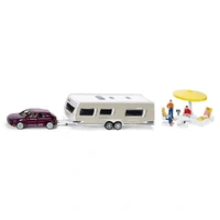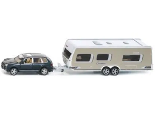 Combination with a Porsche Cayenne Turbo as towing car, with Dethleffs ..Exclusive Emotion.. caravan and numerous accessories. The black Porsche Cayenne was further refined with special imprinting technology. The detailed design includes many features of the Dethleff caravan and extensive lettering on this model making this toy an attractive feature of any collectors display cabinet. The removable roof is another of the caravans special features. This means the figures supplied with the set can be used for hours of play inside the caravan. In addition to various figures, an almost complete camping set is included, with 2 garden chairs, table, sunshade, sun lounger, hammock and grill.
