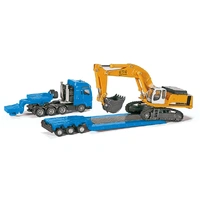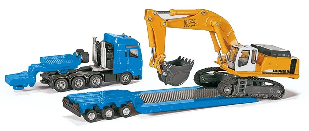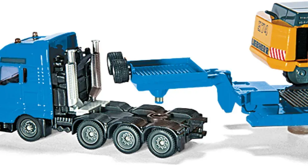 The MAN TG-A in its most impressive format as a 2-axle heavy haulage transporter to 1:87 scale. Design wheel rims with rubber track. Very detailed modelling of exteriors and exhaust to rear of cabin. With coupling system - a 3-axled flat-bed trailer is coupled with swan neck. The flat-bed trailer is fitted with easy-to-manoeuvre mechanics for kids, so its no problem to decouple it from the swan neck. All this makes for more realistic play, recreating the original loading function. The loading vehicle is a large-scale Liebherr digger with low loader.