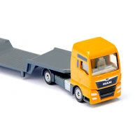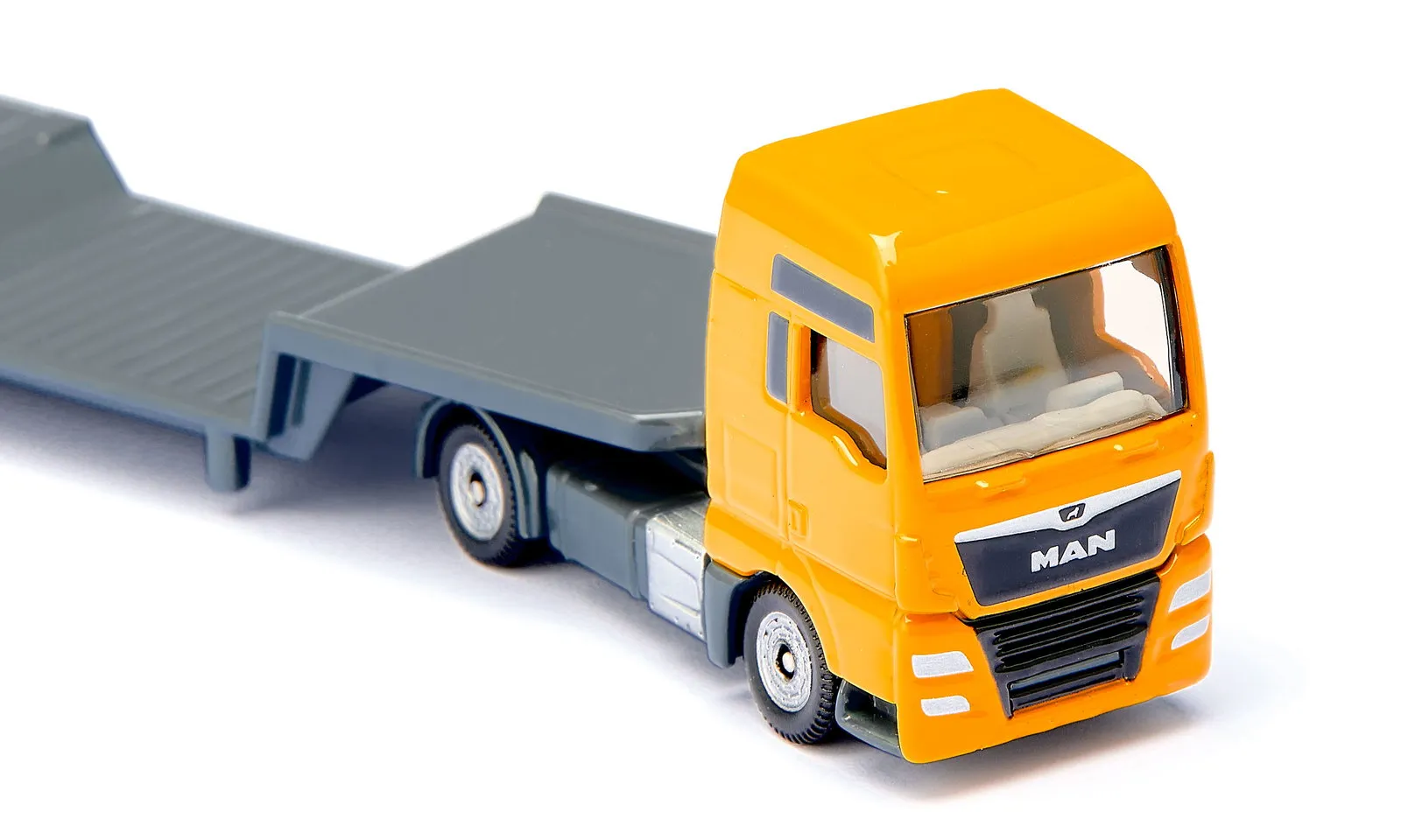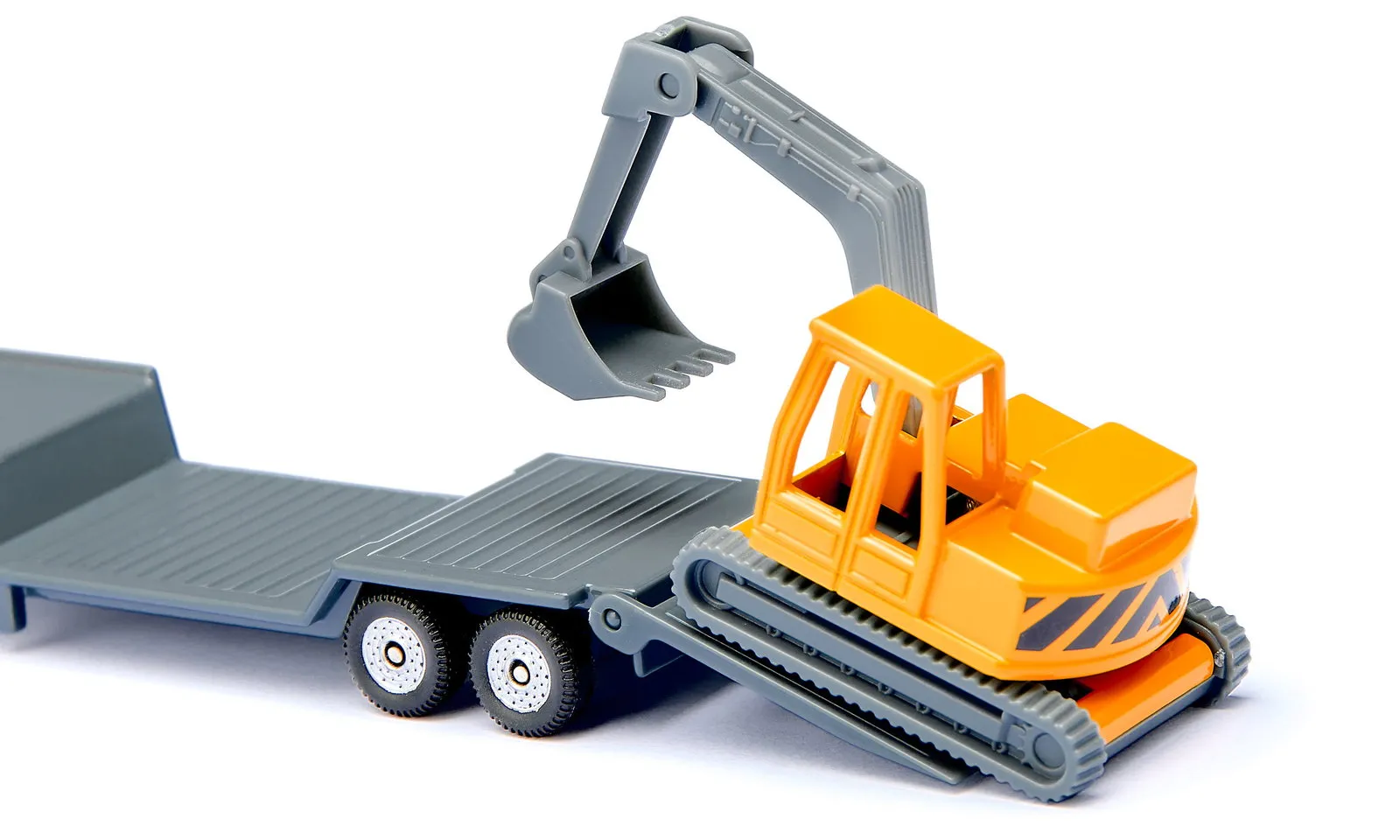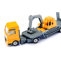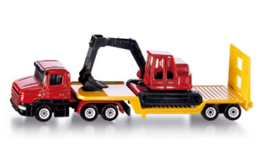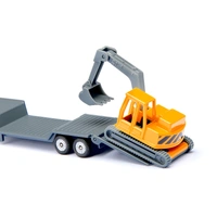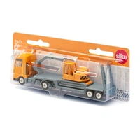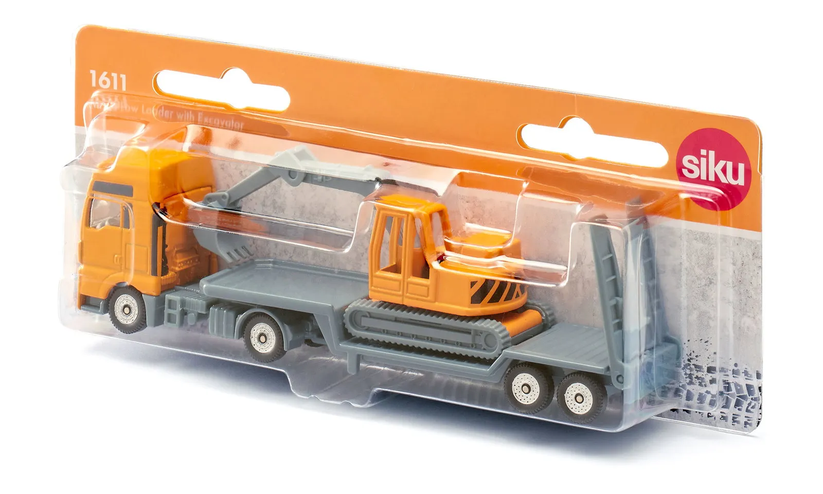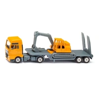 The Siku Low Loader with Excavator faithfully recreates a working construction transport, featuring a movable excavator arm mounted on the low loader trailer. Equipped with rubber tyres and precise die-cast detailing, this model captures authentic construction site equipment in miniature form.