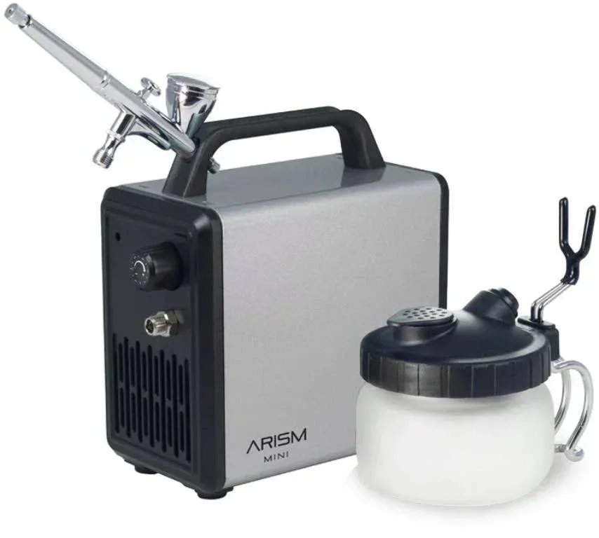 Sparmax ARISM Mini S.Silver with Max-3 Combo The ARISM Mini is a powerful and ultra compact compressor; designed for workbench applications whilst saving the user space. It's a compact unit designed to be portable and easy to store, great for modellers and artists that work on the go! The ARISM Mini also has a built-in airbrush holder on it's handle, meaning less moveable parts to store or change. This is the quintessential compact compressor for all ages and experience levels, and is available in 8 designer color options.