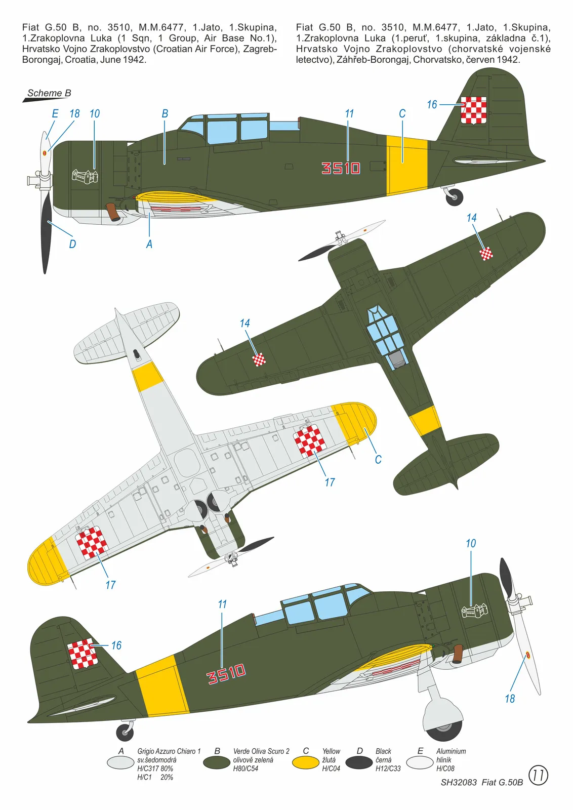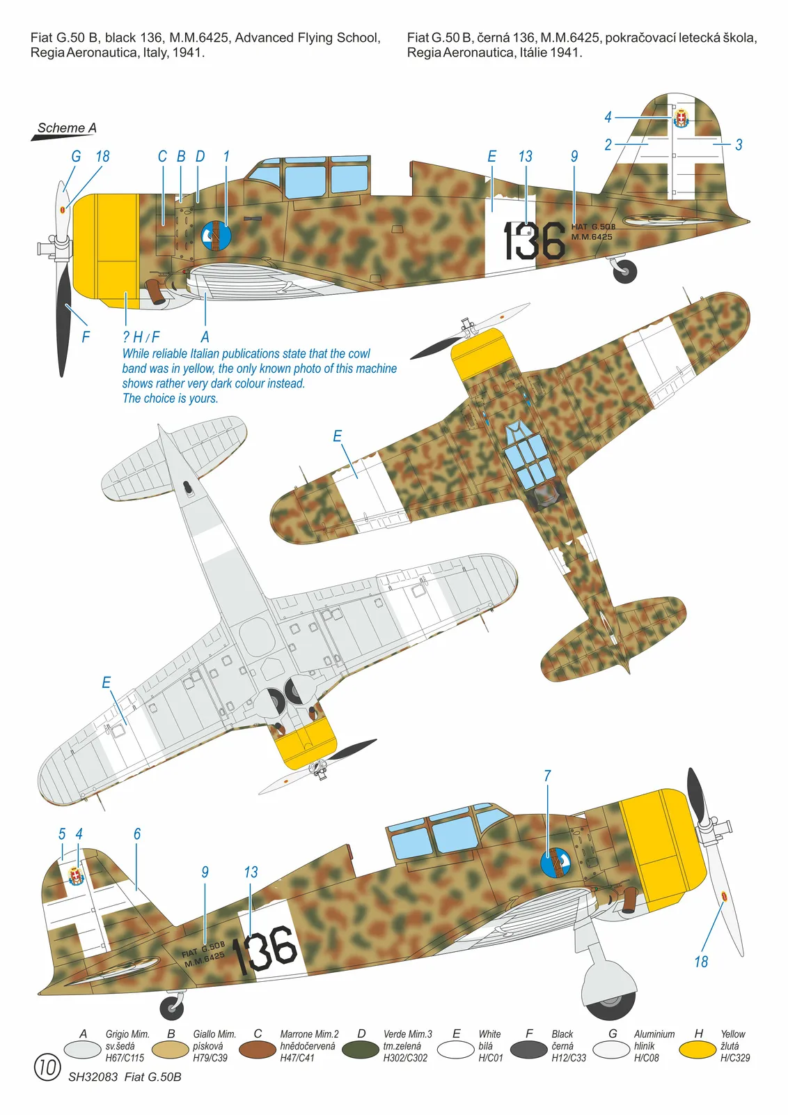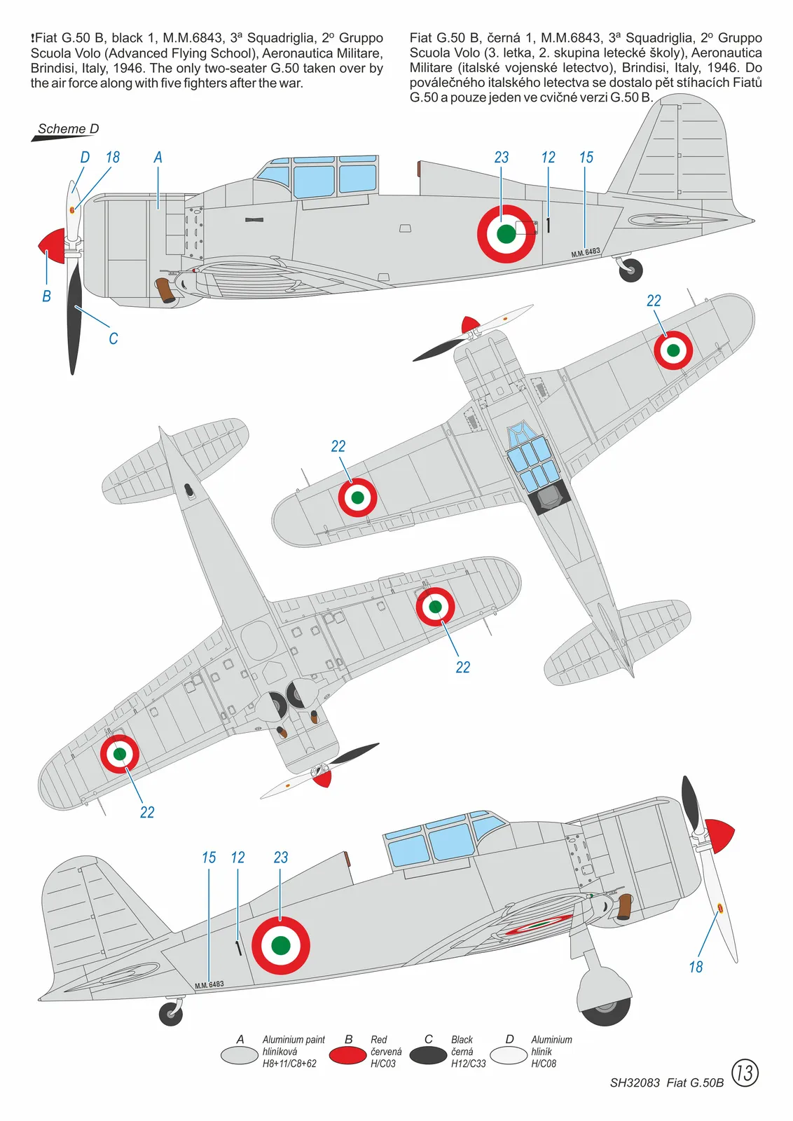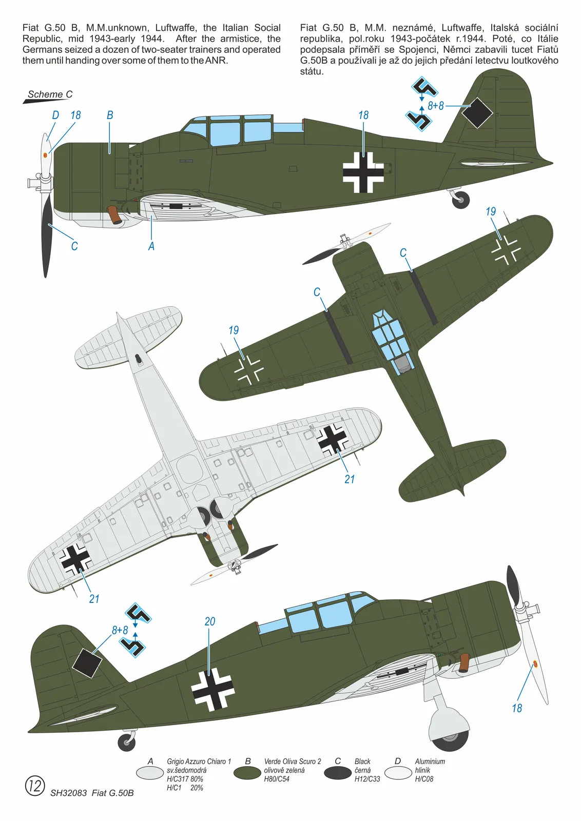 Fiat G.50B Bicomando The Regia Aeronautica, as well as many other air forces during WW2, used two seat machines converted from standard fighter types for the pilot training purposes. In 1940, the RA faced a difficult task as besides new pilots requiring the pilot training, those many already accustomed to flying in the open cockpit of a biplane needed to learn to fly modern, fast monoplanes with retracting undercarriage. And the Fiat G.50B suited this need very well. This two-place variety of the standard G.50 fighter came about by adding another pilot's seat in place of the fuselage armament, in front of the standard cockpit. In total, 100 of these trainers were built and became a welcome addition to the Regia Aeronautica and a few also saw service with the Luftwaffe and the military of Croatia. One such machine survived the war and went on serving with the new Italian Air Force until 1948. The model kit contains five grey styrene sprues, one with clear parts, finely detailed resin parts and etches. The decals cater for four marking options, machines of the Regia Aeronautica, Luftwaffe, Croatian Air Force and the post-war Italian Air Force. - Highly unusual and rare version - colourful schemes - resin cast parts and etches in the box