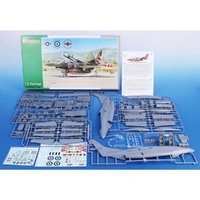 North-American T-2 Buckeye 'Camouflaged Trainer'. Except of its common trainer role in white and red outfit the T-2 aircraft flew or still flies in different colors. T-2s served with US Navy VF-43 Challengers, the Aggressor unit that operates from NAS Oceania. This unit's T-2s served in typical camouflage consisting of various grey colors. Export version T-2D for Venezuela and T-2E for Greece received camouflage of two greens and earth brown on upper surfaces and light grey on lower ones. The Greek machines are equipped with gun sight and some of them even carry weapon pylons. Except of the parts common to SH32037 (T-2 Buckeye "Red & White Trainer") the kit contains more photo-etched parts and resin parts feature T-2E gun sight and pylons. Decals included offer two Greek T-2E machines, Venezuelan T-2D and VF-43 Challengers aircraft.