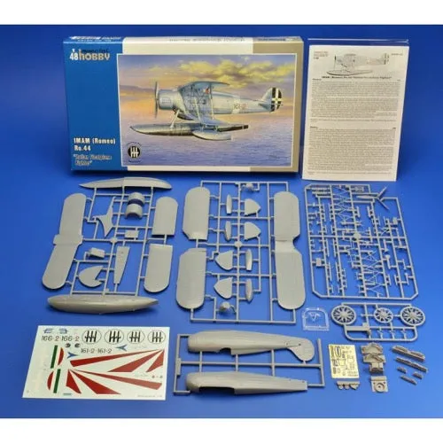 The IMAM Ro.44 was an Italian mixed biplane fighter seaplane with a fixed float undercarriage. The drive in the basic version was provided by a single engine Piaggio P. XR 700 hp . The prototype flight took place in 1936. Serial production began in 1937, leading to the creation of 35 examples of this aircraft. It was armed with two 12.7 mm Breda-SAFAT machine guns. Features - This kit of the fighter version Ro.44 contains the same plastic parts as the previous, differing just in the fuselage parts. - Completely new are the clear parts, while the resin and photo-etched parts are just slightly different. - The decals are also new, offering two machines treated in overall aluminum dope. - The first machine sports Italian tri-color insignia on the fin, and the fin of the second machine was over sprayed with camouflage color and sports a white cross with a Savoy coat of arms. - Parts come molded in gray.