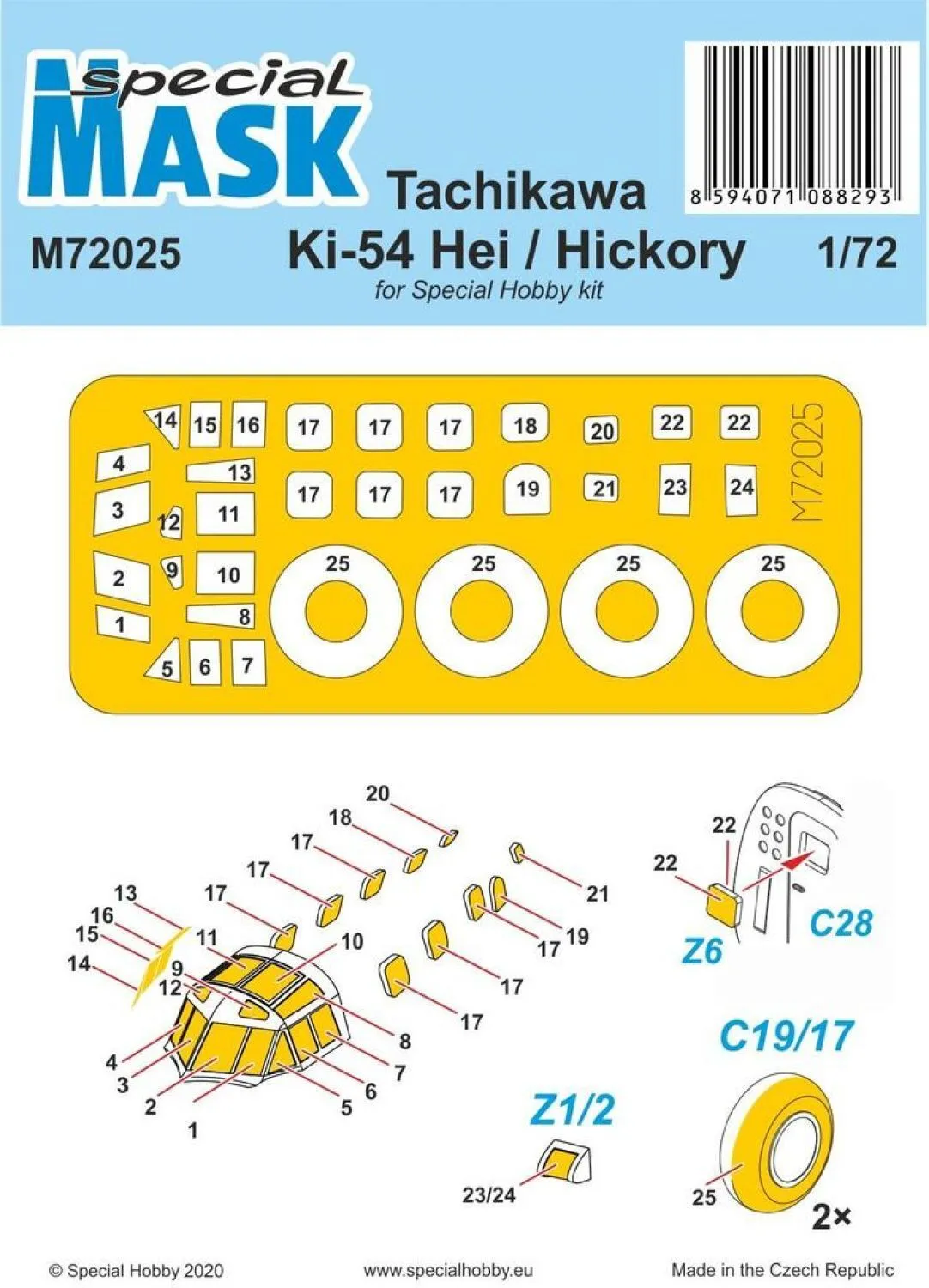 Pre-cut painting mask for clear parts and wheel hubs of Special Hobby's 1/72 Tachikawa Ki-54 Hei / Hickory.