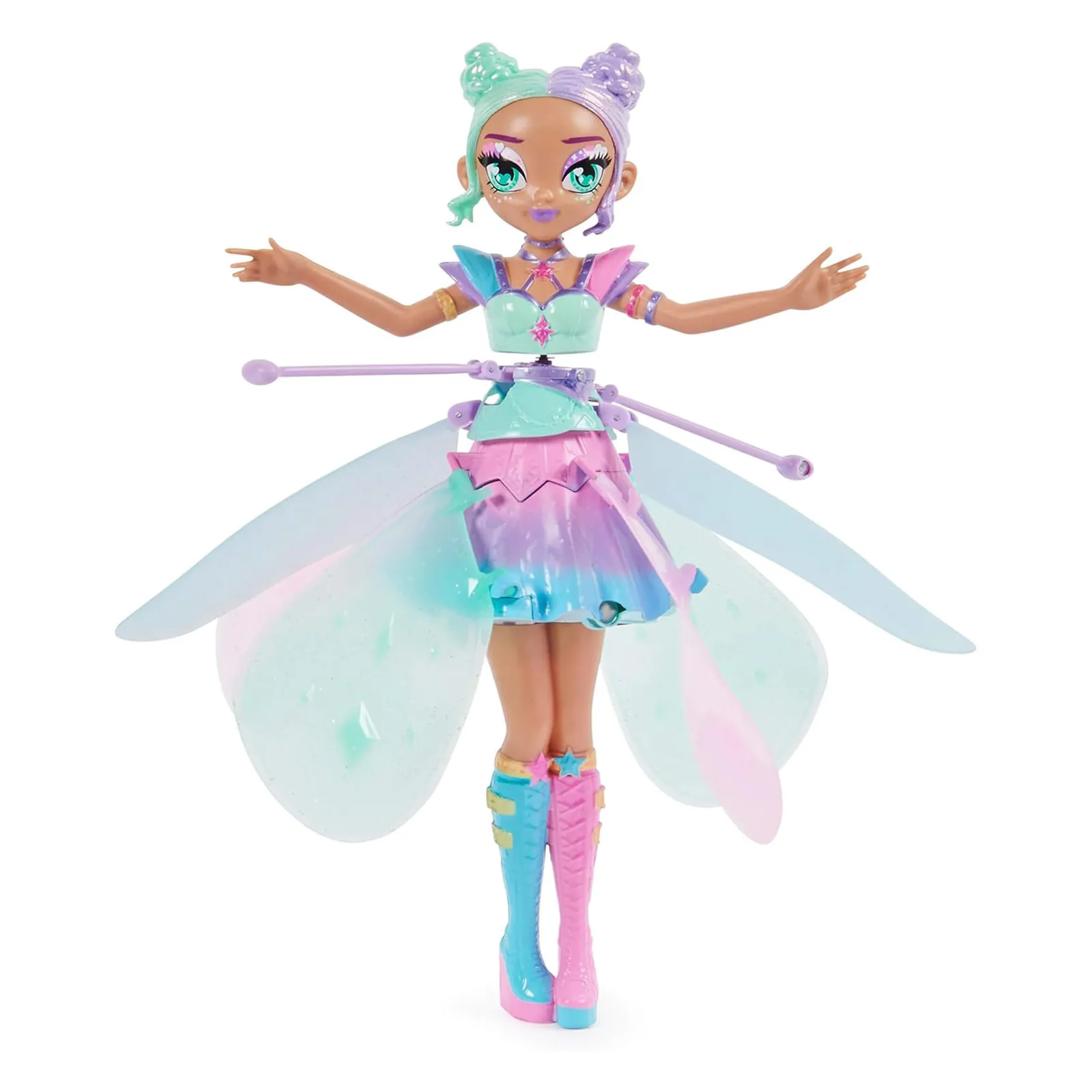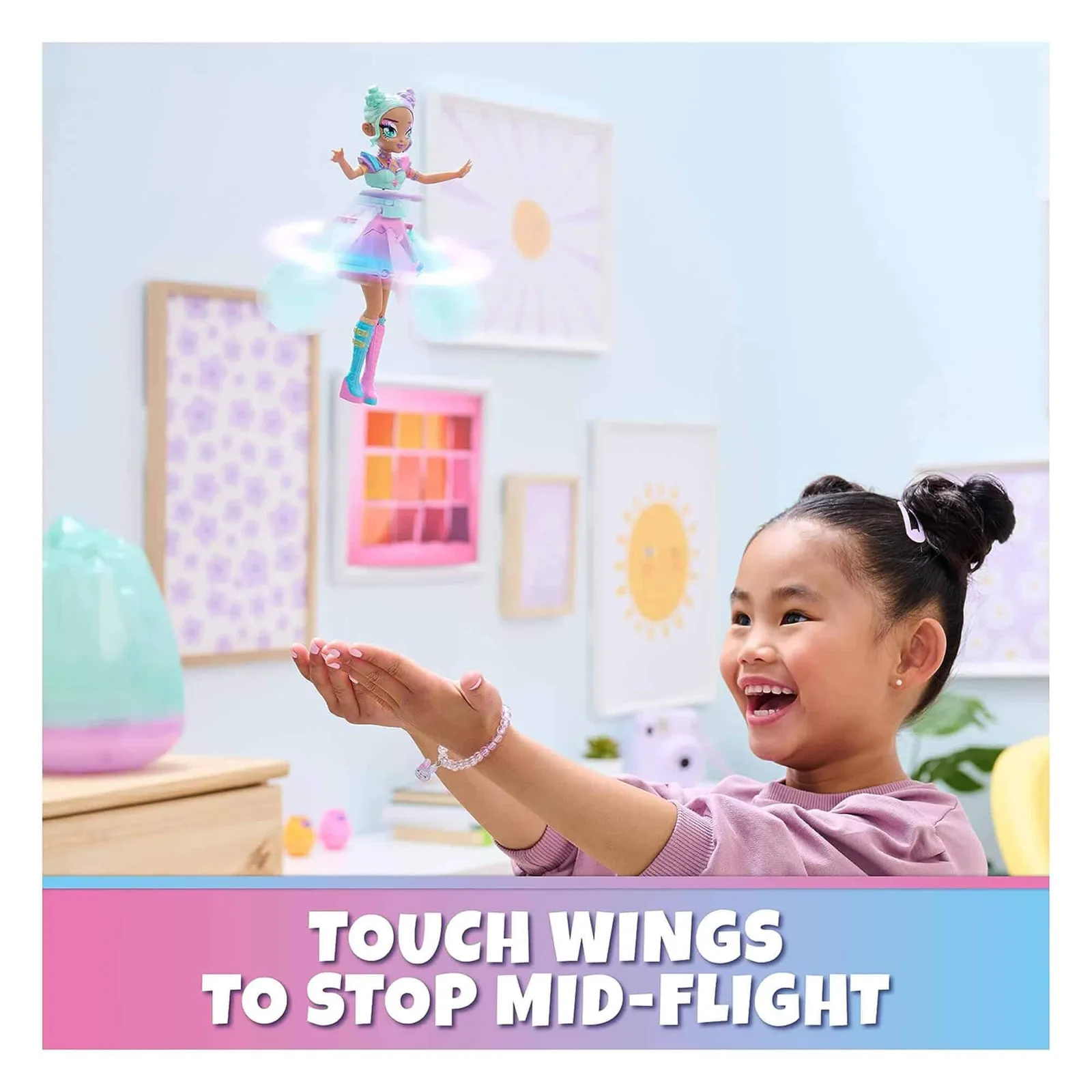 Light up the sky with the Hatchimals Crystal Flyers Pastel Kawaii doll! Crystal Flyers can really fly with your help! Inside the egg, you’ll find a Crystal Flyers doll with glittery wings, makeup, and a pastel dress. Remove your flying toy from her egg and charge her with the included USB cable until she’s ready to air dance! Switch your fairy doll on and the LED lights on her dress pulse as her wings begin to flutter and spin. Let her go and use your magic to guide her! Featuring a built-in sensor, she knows where your hands are as you help her fly indoors. As she hovers above your hands, her dress spins, and her wings sparkle! Made of durable and safety tested materials, if you accidentally touch her wings while she’s flying, it’s safe: her auto-stop feature makes her stop flying. Crystal Flyers toys for girls and boys are perfect for those who enjoy collectibles, action figures, small toys, fashion dolls and doll house play. Great birthday gifts, Christmas gifts or gifts for girls and boys for any occasion. Bring the Crystal Flyers Pastel Kawaii doll to life – the magic is in your hands! SHE LIGHTS UP: When your doll is ready to fly, LED lights on her pastel dress pulse and her wings begin to flutter. As she flies, her dress spins and her wings sparkle, lighting up the sky! SHE REALLY FLIES: Crystal Flyers girl toys can really fly! Launch her from the base or lift her into the air, then use your hands to guide her. She’ll sense if your hands are high or low! GORGEOUS PASTEL DETAILS: Glittery wings, a pastel dress and makeup make this pretty pastel doll a must-have for your Crystal Flyers collection! Display her in the crystal egg. AUTO-STOP & USB RECHARGEABLE: Crystal Flyers flying toys for kids are safety tested and charge with the included USB cable. If you touch her wings mid-flight, she stops flying! Grab her legs to reposition her during flight. TOYS FOR 5 YEAR OLD GIRLS AND BOYS: Crystal Flyers dolls are perfect gifts for 5 year old girls and boys who enjoy dolls & accessories, surprise toys, toy figures & playsets. Collect them all (toys each sold separately) Features: Lights up with LED dress and sparkling wings Flies with hands-on guidance Glittery wings, pastel dress, and makeup Auto-stop safety feature USB rechargeable Ideal for 5-year-old girls and boys Content: Includes 1 Crystal Flyers, 1 USB Charging Cable, 1 Crystal Egg Display Case, 1 Instruction Sheet Suitable for ages 5 years+