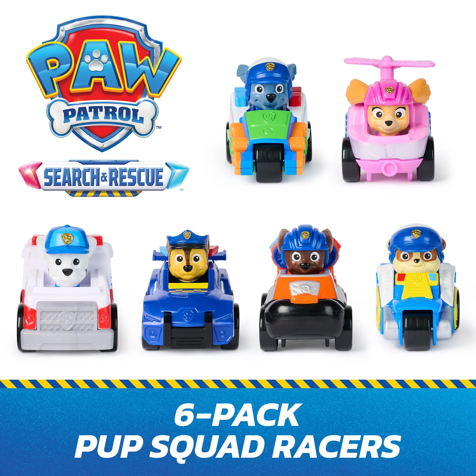 Join the PAW Patrol Pup Squad for turbo-charged adventures with the Serach & Rescue Pup Squad racers! This set of PAW Patrol toys includes all six main pups: Chase, Marshall, Skye, Rubble, Rocky, and Zuma. Each racer is styled just like the rescue vehicles from the show, bringing the excitement of Adventure Bay right to your home. With real working wheels, these 2.5-inch racers are ready to zoom into action, whether for a birthday, holiday, or just a fun day of pretend play. Their compact size makes them PAWfect for on-the-go rescue missions, fitting comfortably in the palm of your hand. These PAW Patrol learning toys are PAWsome for a birthday, or any holiday. Relive cherished moments from past PAW Patrol seasons, like the Mighty Pups and PAW Patrol Movie, or create new adventures with a PAW Patrol tower, individual PAW Patrol action figures and their PAW Patrol vehicles, for turbo-charged adventures