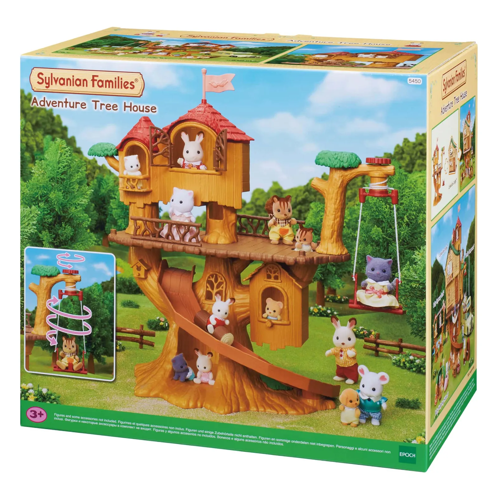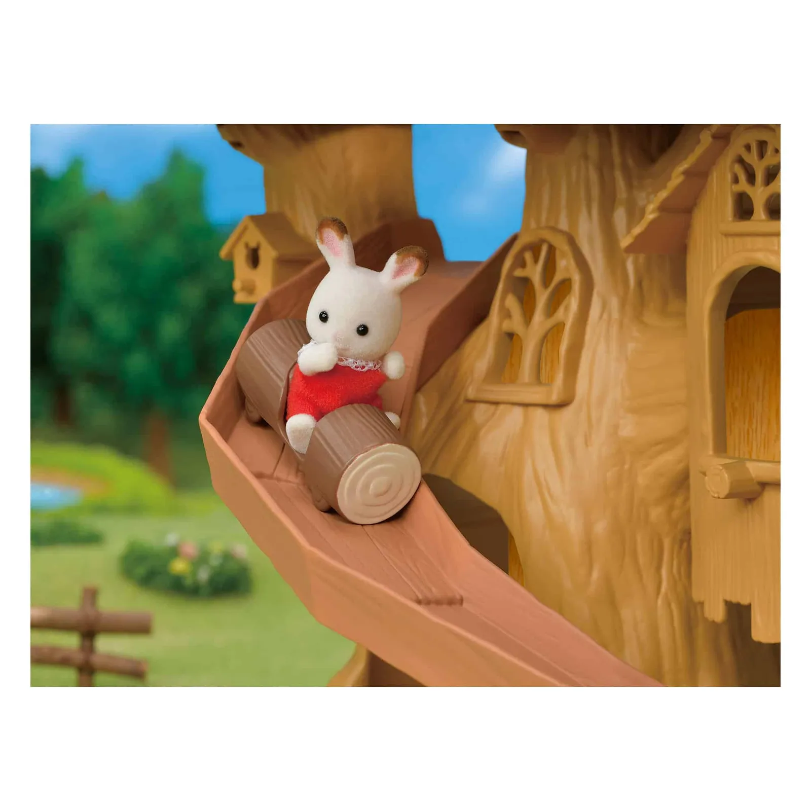 Take your Sylvanian Families figures on a fun day outdoors with this Adventure Tree House. It includes a rope swing that can go up and down. Place the log ride on the huge slide to make it go down. There are four small rooms and a secret passage inside the tree, just for the babies. The hut on the terrace can be removed and played with separately. It's the perfect play area for your figures!