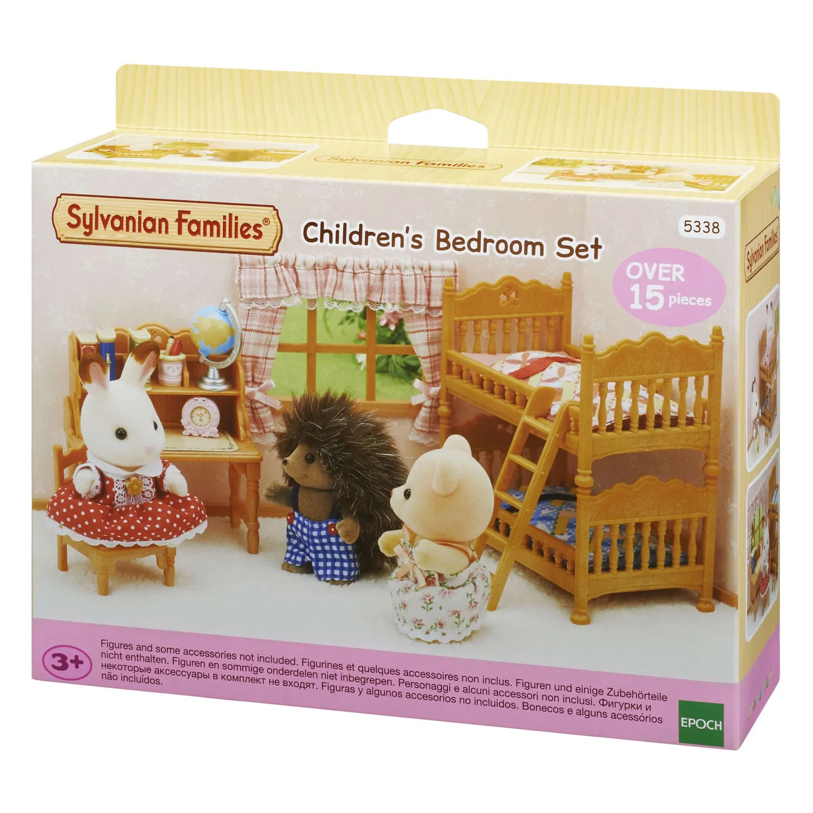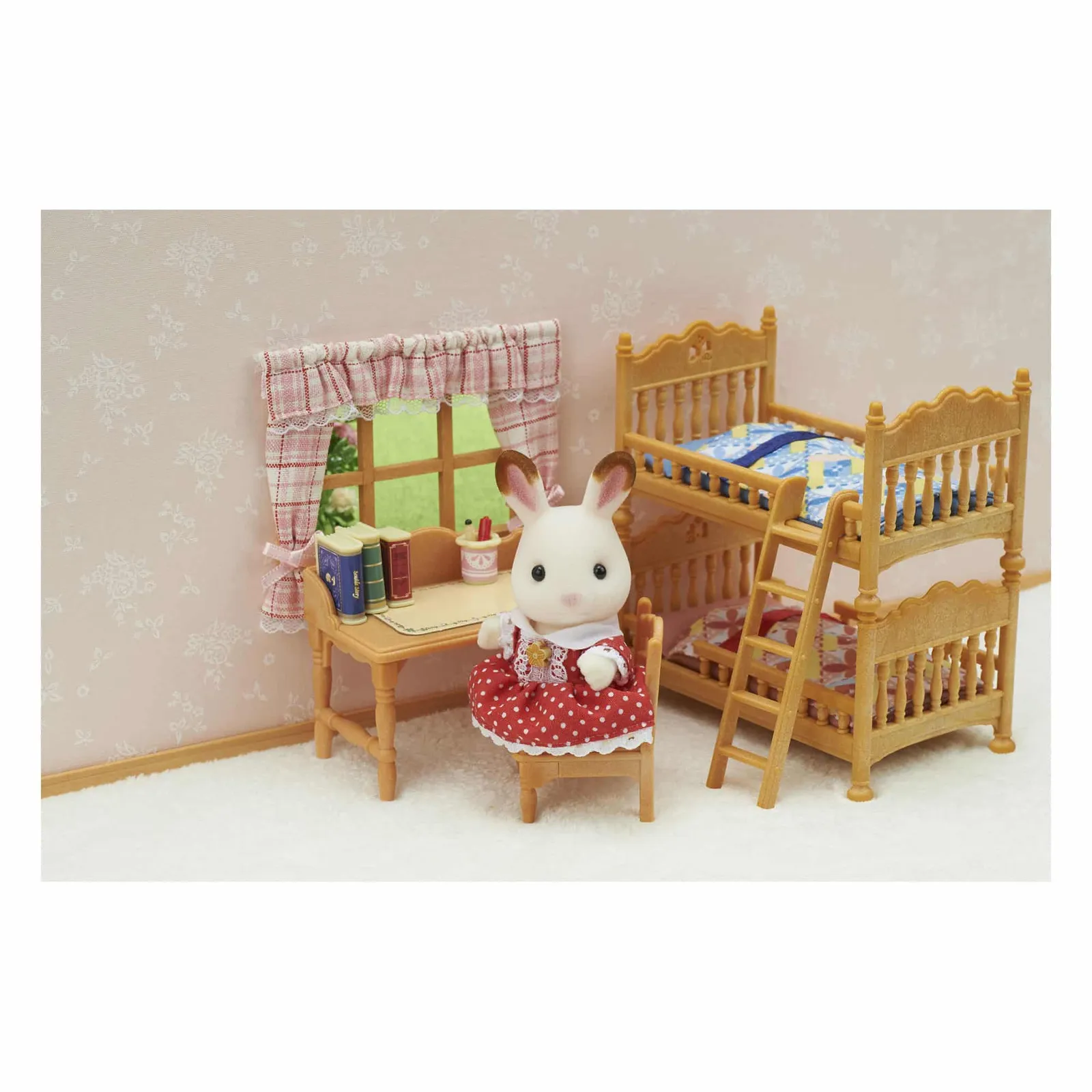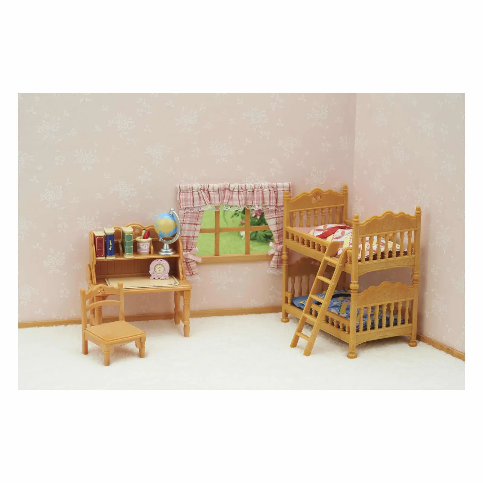 The Children’s Bedroom Set features beds that can be detached and used individually, or together as a bunk bed. Set includes: Bed x2, Ladder, Mattress x2, Bedding x2, Child’s Desk, Chair, Shelf, Mat, Pencil, Red Pen, Pen Stand, Desk Clock, Book x3, Globe (a total of 19 pieces) Figures not included Suitable for ages 3 years+