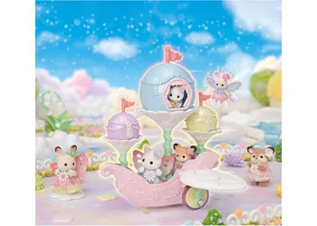 A set containing a skyship with lots of fun features and the Latte Cat baby in a cute fairy costume. The wings of the skyship flap up and down as it moves. Child and baby figures can sit in the skyship. The skyship can be placed on its stand and used as an ornament. It looks like it's really flying!