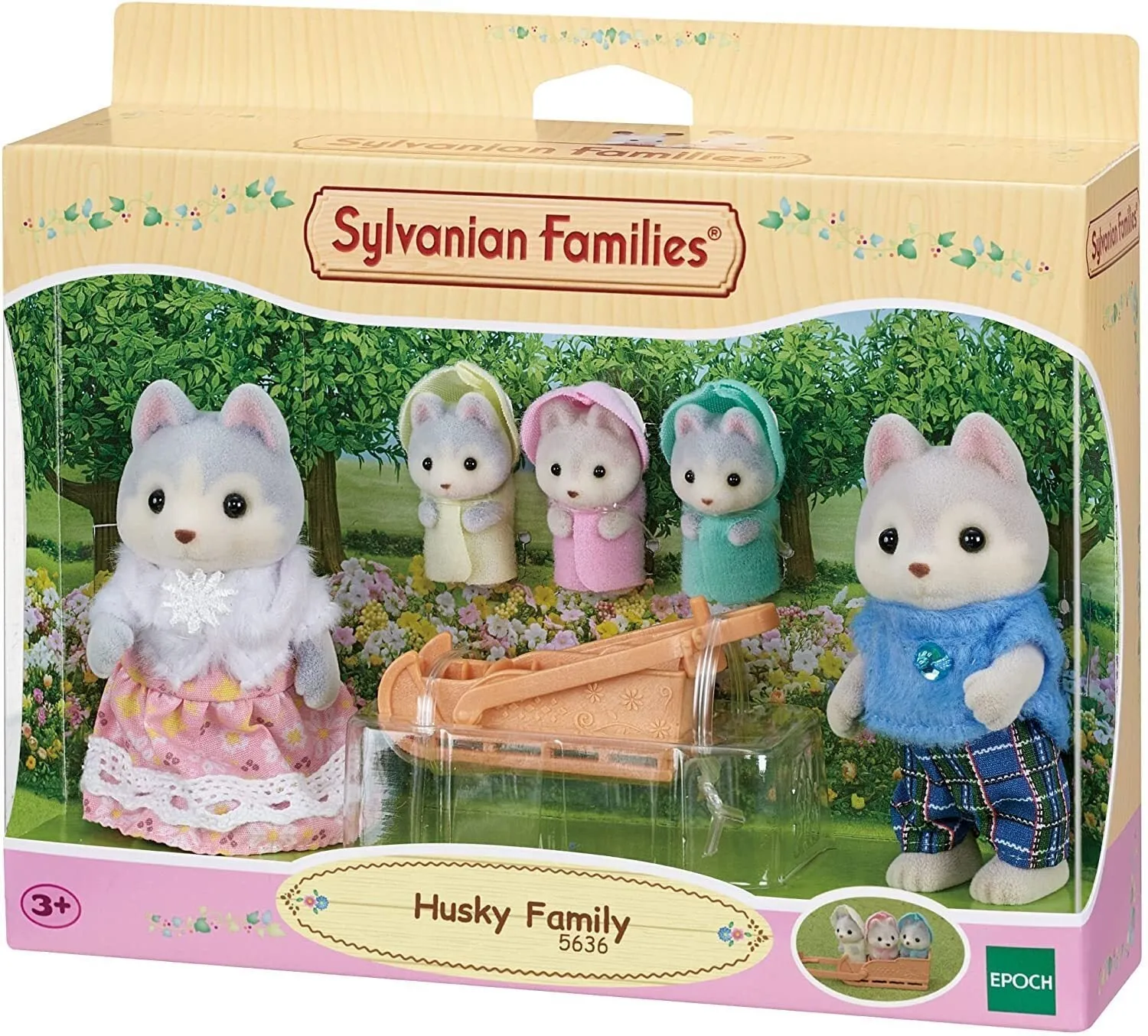 Free Shipping For Orders Over $150 To Metro Areas* (Online orders only)Sylvanian Families - Husky Family The Husky Family set contains five figures: father Vincent, mother Avril, and triplets Rae, Drake, and Nelly, as well as a sleigh for the triplets.