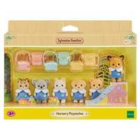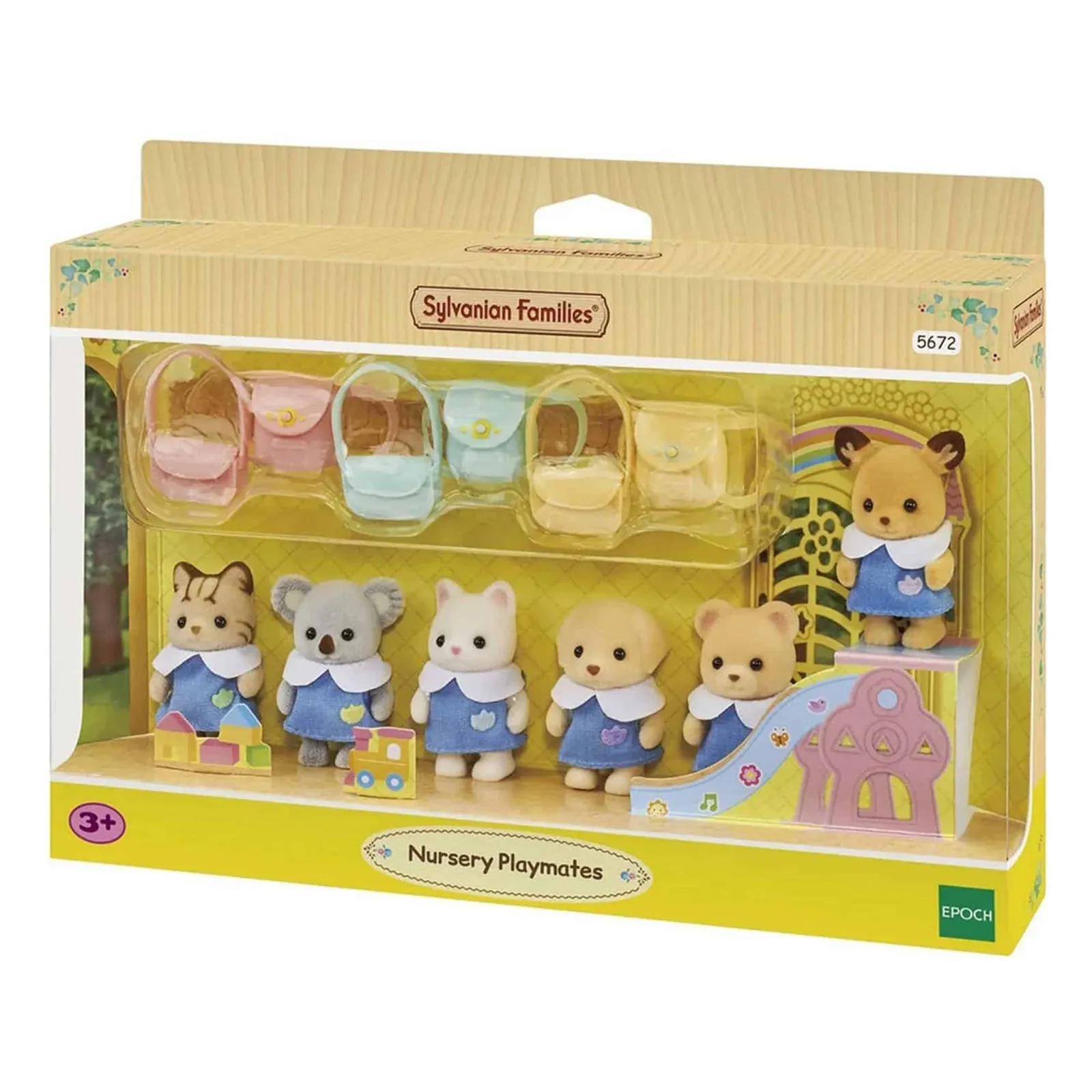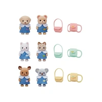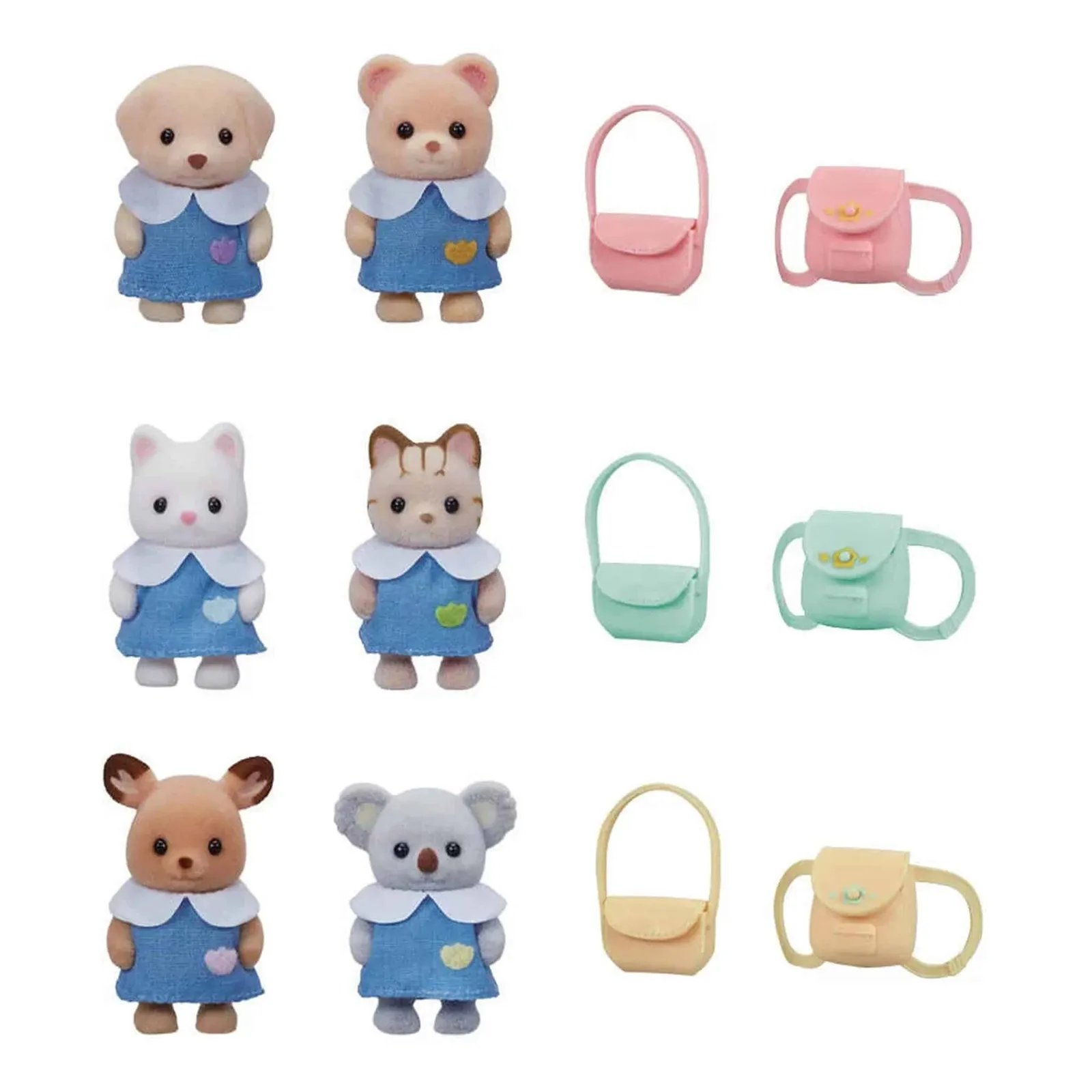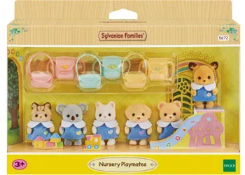 Sylvanian Families – Nursery Playmates SF5672 A collection of six adorable baby figures, each with their own nursery school uniform and bag. The fabric clothing can be removed to change the figures’ outfits. Combine with the Baby Castle Nursery and Sunshine Nursery Bus (sold separately) for even more fun imaginative playtime! Stimulates imaginative role-playing for children. Contents: Striped Cat Baby, Koala Baby, Silk Cat Baby, Yellow Labrador Baby, Bear Baby, Deer Baby, Nursery Shoulder Bags x3 (Pink, Mint Green, Yellow), Nursery Rucksacks x3 (Pink, Mint Green, Yellow) Features: Made with attention to details. A great gift idea for birthday and Christmas. Suitable for ages 3 years+