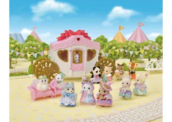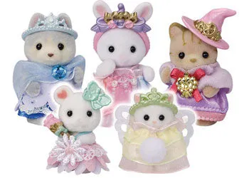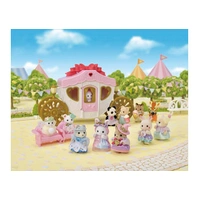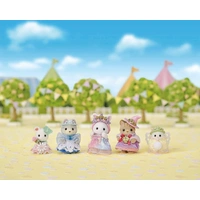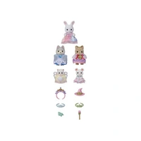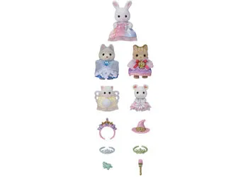 Sylvanian Families - Royal Princess Set When you visit the Baby Amusement Park there are so many fun things to see and do. Today white rabbit baby sister Sophie Snow and her friends are playing princess dress-up. There are beautiful outfits to choose with gowns, crowns, tiaras and more. Once everyone has chosen their outfit, they all head outside to join in the Costume Parade and everyone in the crowd waves to them as they walk by in their colourful costumes. Play together with the Royal Carriage Set (sold separately) for even more fun! Set includes five baby figures - Snow Rabbit baby, Sophie, Husky baby Linnea, Striped Cat baby Apricot, Marshmallow Mouse cradled baby Mary and Persian Cat cradled baby Briana. Ages: 3+