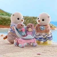 The Sea Otter family are adorable round characters with small ears and diamond-shaped noses This set includes the mother, father and cradled babies wearing outfits with a shell motif, with a pram and a shoulder bag The two cradled babies can ride in the shell pram Stimulates imaginative role-playing for children Suitable for ages three years and above