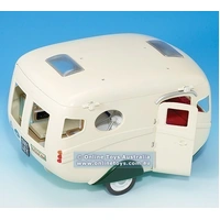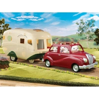 The Sylvanian Caravan has everything needed for staying away from home. Open up the roof and side to reveal a very well equipped kitchen area with sink, stove, drawers, cupboards and even a fold-out ironing board. There’s a seating area which converts into a double bed and coffee table. There are 2 further fold-out bunks on board. Towards the rear there’s a shower room with fold-down loo and a wash-hand basin. Comes with over 30 accessories. The Caravan is designed to be towed by any Family Car (sold separately). Contents: • Over 30 pieces including 1 Caravan with built-in furniture, 2 sleeping bags, kitchen utensils, bathroom accessories, pretend games and maps and a connecting joint.