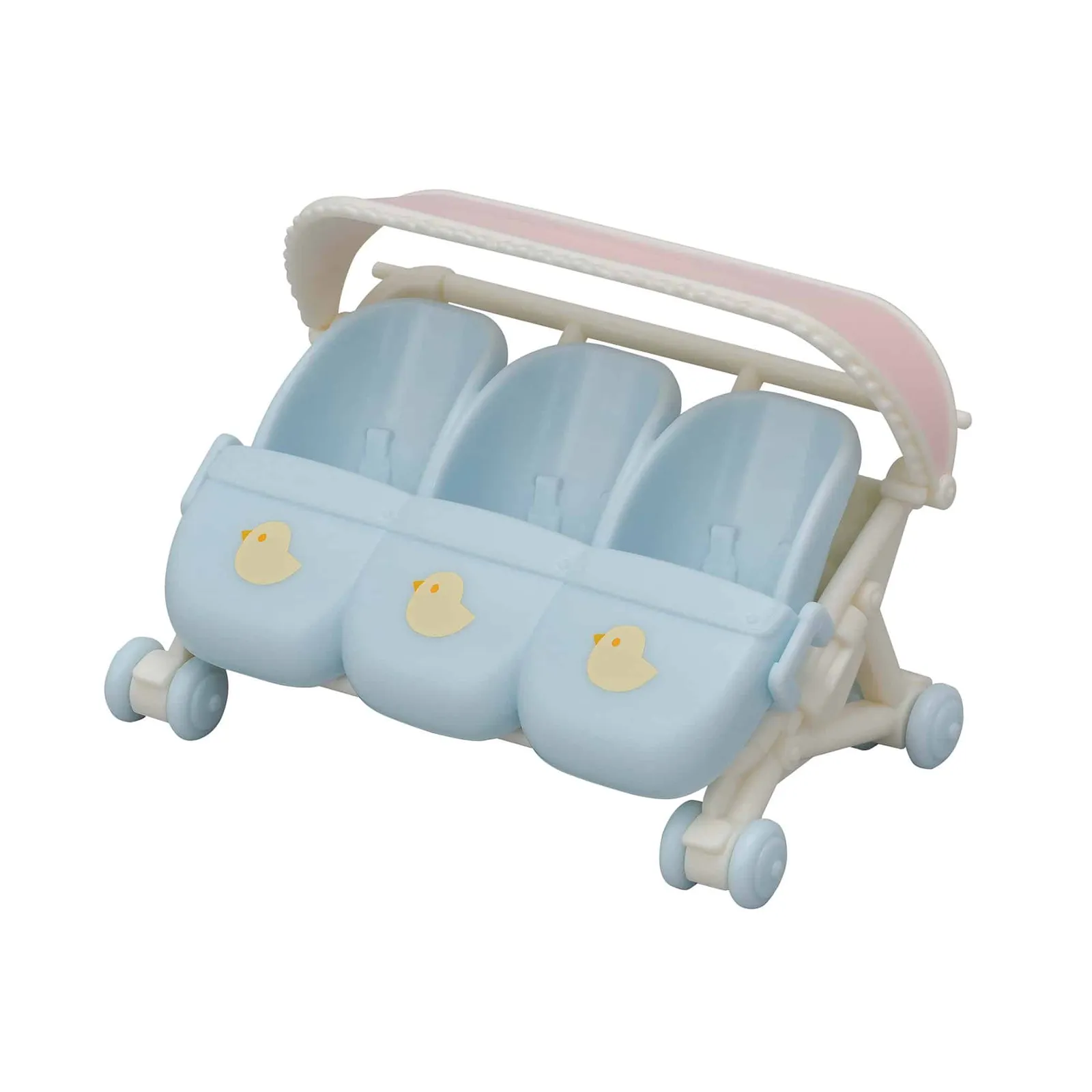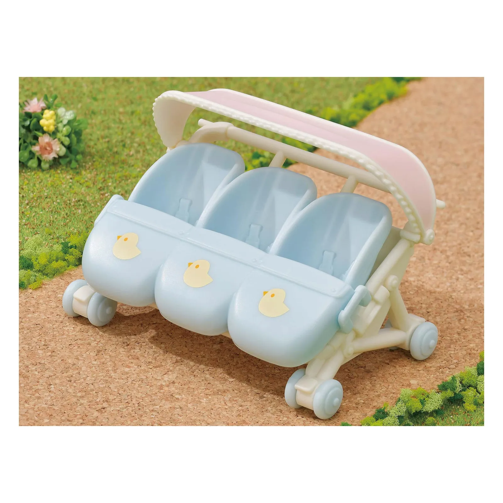 The Triplets Stroller is a pushchair for baby triplet figures. By removing the seat, you can make space for a baby and a pair of twins. Can also be used as a child seat for other vehicles in the series, such as the Picnic Wagon, Family Saloon Car, and Family Campervan (all sold separately). Set includes: Pushchair, Canopy, Seat, Seat cover (a total of 4 pieces) Figures not included. Warning : Not suitable for children under three years. Chocking hazard – small parts. Suitable for ages 3 years+