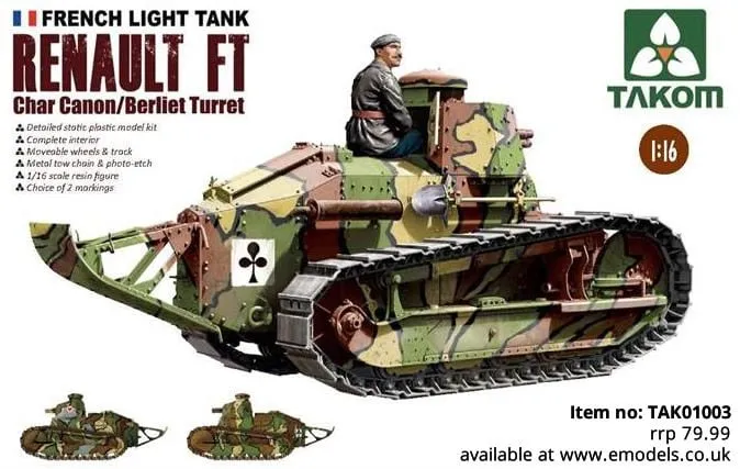 Free Shipping For Orders Over $150 To Metro Areas* (Online orders only)Takom brings you 01003 a 1/16th large scale plastic kit of the Renault FT-17 French Light Tank with Detailed interior and it Includes Resin Figure with Photo-etch parts & metal tow chain.