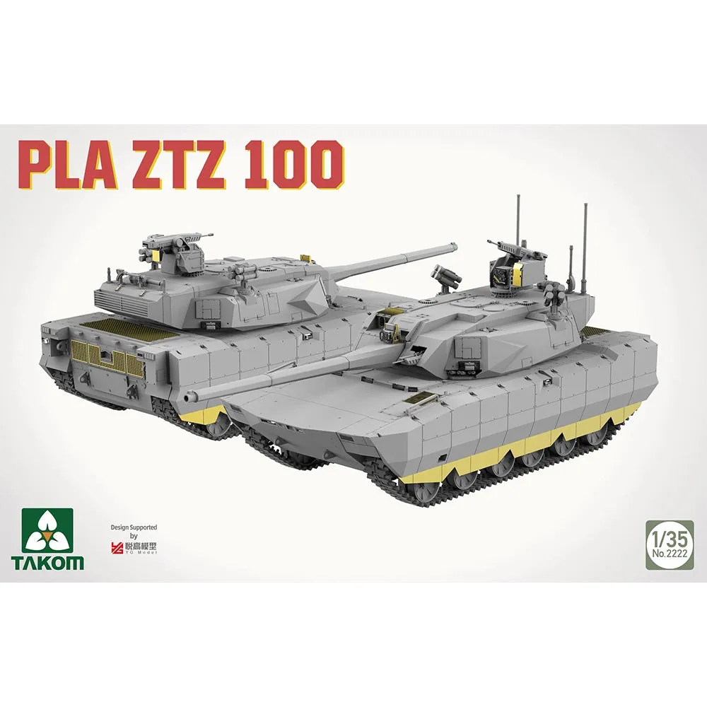 Chinese Army ZTZ-100 Main Battle Tank. The ZTZ-100 (Type 100) is a fourth-generation main battle tank (MBT) developed for the People's Liberation Army (PLA). First displayed publicly during the 2025 Victory Day Parade, the vehicle is scheduled for induction into the PLA Ground Force between 2025 and 2026. Its design incorporates an unmanned turret and a three-person crew capsule located within the hull. Primary armament is a 105 mm autoloaded gun. Secondary armament consists of a remote weapon station (RWS) mounting a 30 mm autocannon and a 12.7 mm machine gun for anti-infantry and light-armour engagements. Protection is provided by a combination of passive composite armour and a dual GL-6 Active Protection System (APS) intended to intercept guided missiles and top-attack munitions. The vehicle utilises a 1,500 hp hybrid diesel-electric powertrain, providing a top speed of approximately 80 km/h (50 mph) and a reduced acoustic and thermal signature. As a network-integrated platform, the ZTZ-100 functions as a data node, linking with unmanned aerial vehicles (UAVs), artillery, and other combat units for cooperative targeting and beyond-visual-range engagements. The ZTZ-100 indicates a shift in Chinese armoured doctrine towards lighter, automated platforms. The design prioritises electronic integration and situational awareness over the traditional heavy-tank mass found in earlier ZTZ-96 or ZTZ-99 variants. Hatches can be fitted open or closed. Moveable suspension and road wheels, workable tracks. Photo-etch parts included. Choice of 2 markings. Box code: No.2222. Box description: PLA ZTZ 100. 1:35 scale plastic model kit from Takom, requires paint and glue.