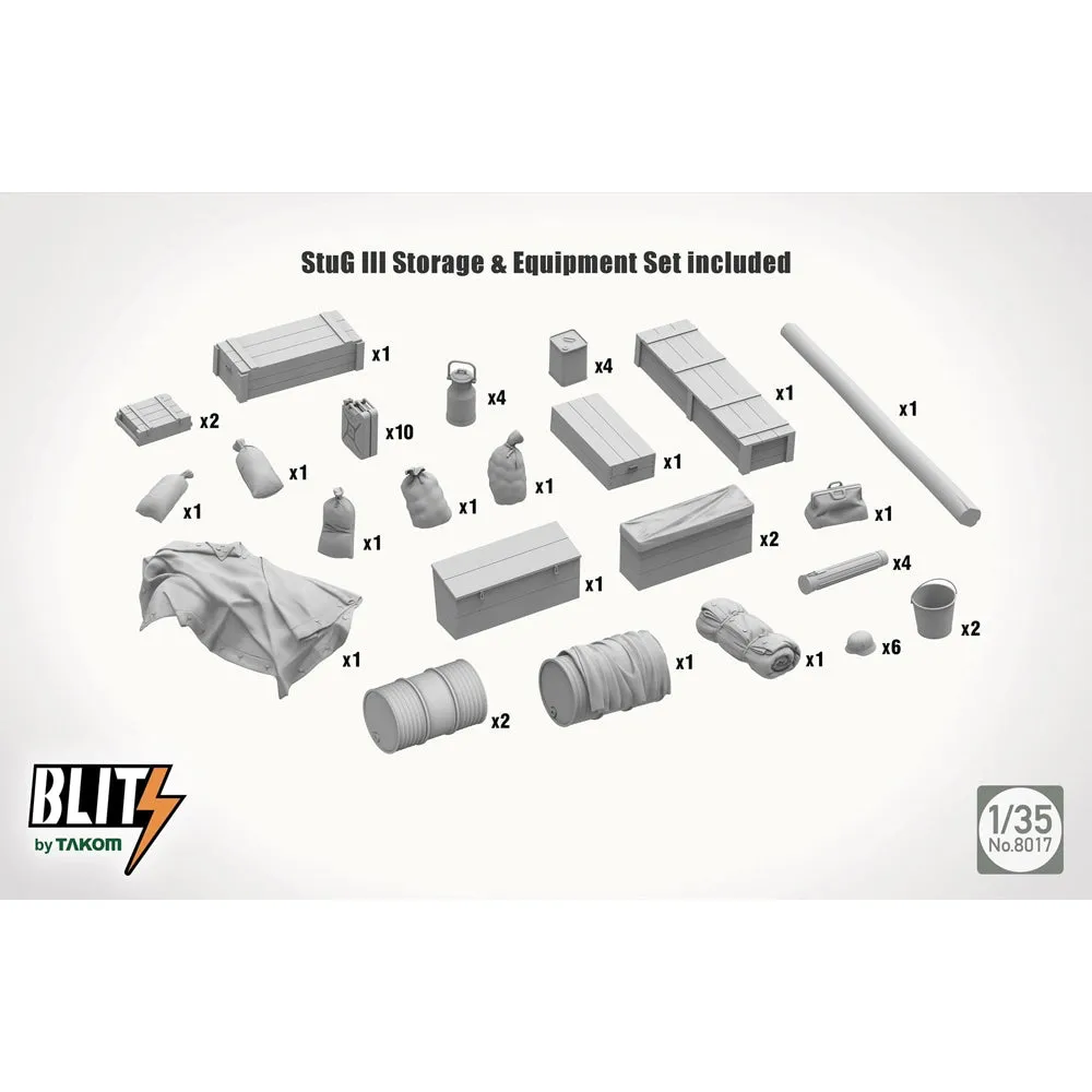 German WWII StuH 42/StuG III Ausf G Mid Production Assault Gun 2 in 1. Takom Blitz series with two build options. Metal barrels included. Hatches can be fitted open or closed. Link & Length tracks, photo-etch parts. Choice of 4 markings. (Figure not included). 1:35 scale plastic model kit from Takom, requires paint and glue.