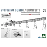 V-1 Flying Bomb Launch Site Fieseler Fi 103 winged Vengeance or Retaliation Weapon 1 on Hellmuth Walter Werke designed slotted-tube slingshot/catapult (Flugelbombe, Vergeltungswaffe 1, "V-1", Schlitzrohr, Schleuder) developed in 1939 at Peenemunde Army Research Centre on the north eastern tip of Germany. Numerous launch ramps were installed by the Nazis at strategic locations in the Pas-de-Calais region of Northern France, pointed towards London and the South Coast from Dover to Plymouth, as well as Bristol and Manchester. By late 1943 some 96 launch sites had been located by air reconnaissance, and targeted during the long-running Allied bombing op "Crossbow" which took out some sites before they got started, but it didn't prevent more than 9000 flying bombs being launched against London and the South East during 1944. In late 1944/early 1945 launch sites were repositioned in the Netherlands to strike Antwerp and the liberated Low Countries. While various launch ramps survive the only intact example can be seen at the Imperial War Museum Duxford. Includes V-1 (without interior). Ramp length 960mm. Starter, steam catapult & spare launch piston included plus photo-etch & clear parts. Choice of 4 markings. Figures not included.