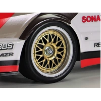 • Two-piece mesh wheels (Item 50548 design) have silver colour rims and gold colour spokes. They are paired with racing slick tires.