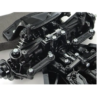 The shaft driven 4WD TT-02 chassis employs a longitudinal layout with the battery on the left and the motor on the right, to offer excellent stability. In addition, it features identical left and right suspension arms and uprights for ease of assembly, plus easy-to-maintain gearboxes. It is a highly adaptable chassis, as it offers 2 different wheelbases, 2 ground clearance settings and 2 tread set-ups in addition to a range of 10 possible gear ratios. It is not short on looks either, with brake disc-shaped wheel hubs and stylish front bumper supports.