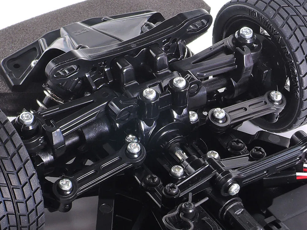 The shaft-driven 4WD TT-02 chassis employs a longitudinal layout with the battery on the left and the motor on the right, to give excellent stability. In addition, it features identical left and right suspension arms and uprights for ease of assembly, plus easy-to-maintain gearboxes. It is a highly adaptable chassis, as it offers 2 different wheelbases, 2 ground clearance settings and 2 tread set-ups in addition to a range of 10 possible gear ratios. It is not short on looks either, with brake disc-shaped wheel hubs and stylish front bumper supports. 10-spoke wheels feature rim stickers and are paired with tread-patterned racing radial tires.