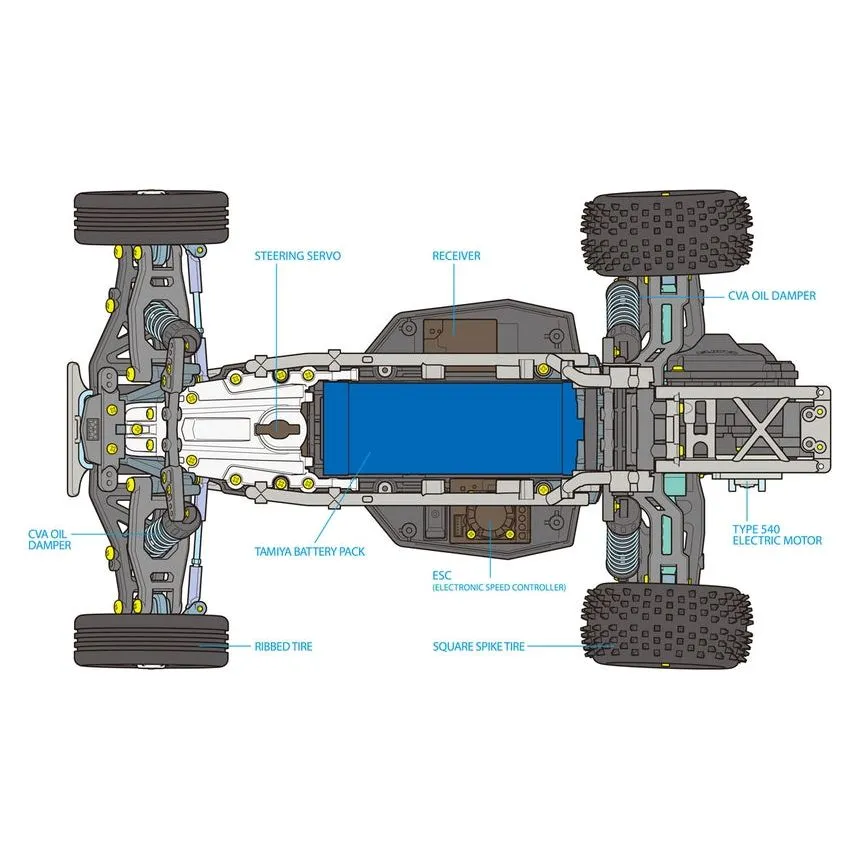 Choose your wheelbase (265 mm or 280 mm) to optimize handling or stability, and launch yourself into the off-road assault! The Tamiya RC Fighter NXGEN (Ref 58741 ) represents the new generation of RC buggies thanks to an ingenious DT-04 chassis , modular and compatible with many parts from other Tamiya ranges .