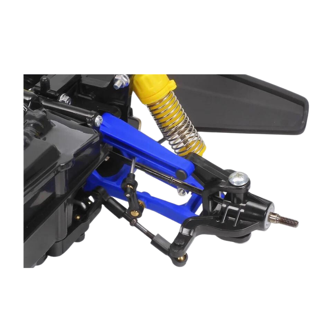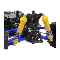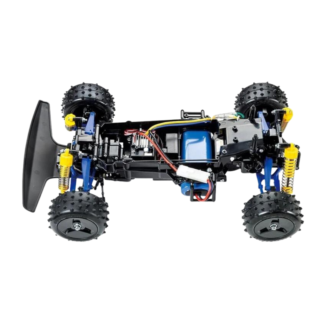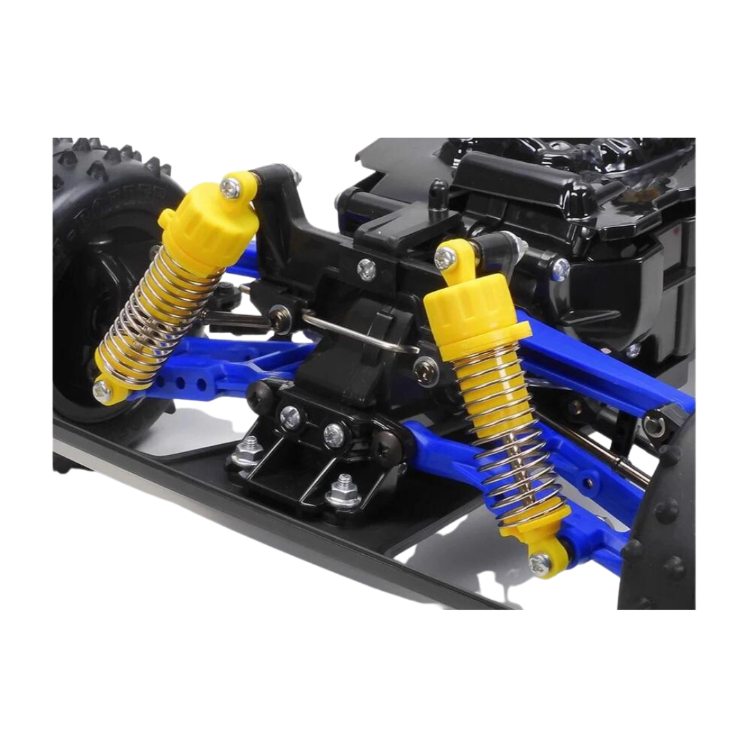 The chassis features a shaft-driven 4WD drivetrain married to a lightweight and tough bathtub frame that employs front and rear gearboxes with the suspension attached to them; that suspension utilizes upper "I" and lower "H" arms, and offers a ground-hugging drive. CVA oil dampers and a front stabilizer contribute further to an excellent drive. Both gearboxes house a gear differential, and are compact to ensure plentiful ground clearance. The kit also features an aluminum motor mount for superior heat dissipation.