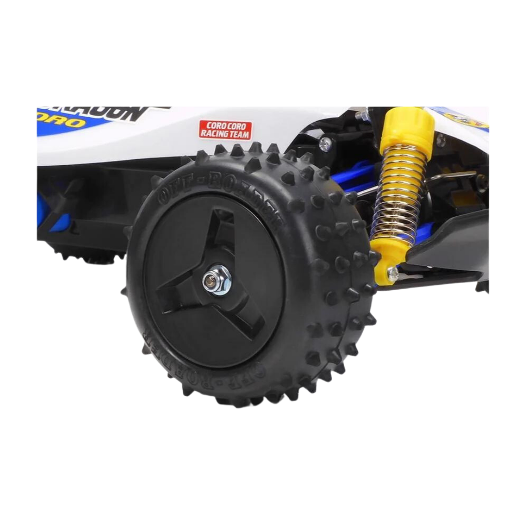 This R/C assembly kit recreates the 4WD buggy Saint Dragon which was the main model of a popular 1980s Japanese comic. The chassis consists of a tough bathtub frame plus front and rear gearboxes with suspension attached. 4-wheel double wishbone suspension uses CVA oil dampers for a superior ride, and a front stabilizer for a firm setup. The stylish body is molded in polycarbonate and pre-painted white, just requiring application of stickers to finish it.