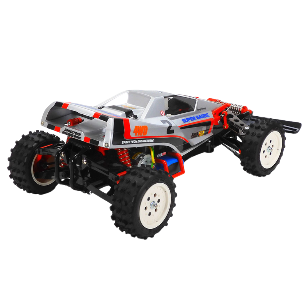 • 1/10 scale R/C model assembly kit. Updated version of the Super Sabre, a beginner-friendly buggy originally released in 1987. Length: 390mm, width: 234mm, height: 135mm.