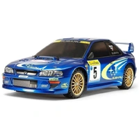 The 1999 version of the two-door Subaru Impreza rally car was a highly balanced beast, with 4-cylinder turbocharged all-aluminum boxer engine, a drive-by-wire throttle and semi-automatic 6-speed transmission. This R/C model assembly kit recreates the Impreza from the year's opening rally in Monte-Carlo, with the form faithfully depicted in durable polycarbonate, and separate parts used to recreate rear wing and side mirrors. Stickers are included to recreate the multitude of team and sponsor logos. The model runs on the adaptable TT-02 chassis, which is equally at home on road and flat dirt surfaces.