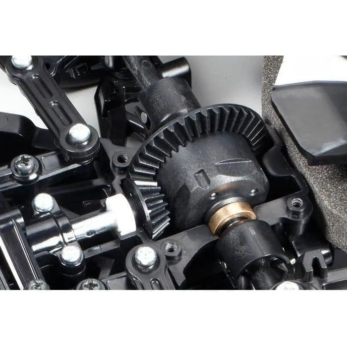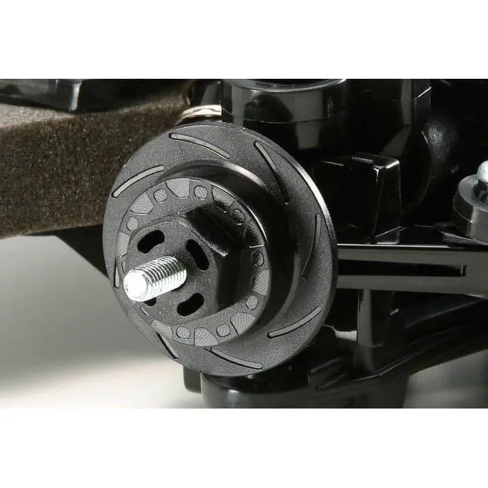The shaft-driven 4WD TT-02 chassis employs a longitudinal layout with the battery on the left and the motor on the right, to give excellent stability. In addition, it features identical left and right suspension arms and uprights for ease of assembly, plus easy-to-maintain gearboxes. It is a highly adaptable chassis, as it offers 2 different wheelbases, 2 ground clearance settings and 2 tread set-ups in addition to a range of 10 possible gear ratios. It is not short on looks either, with brake disc-shaped wheel hubs and stylish front bumper supports. Gold color fin-spoke wheels are paired with rally block tires.