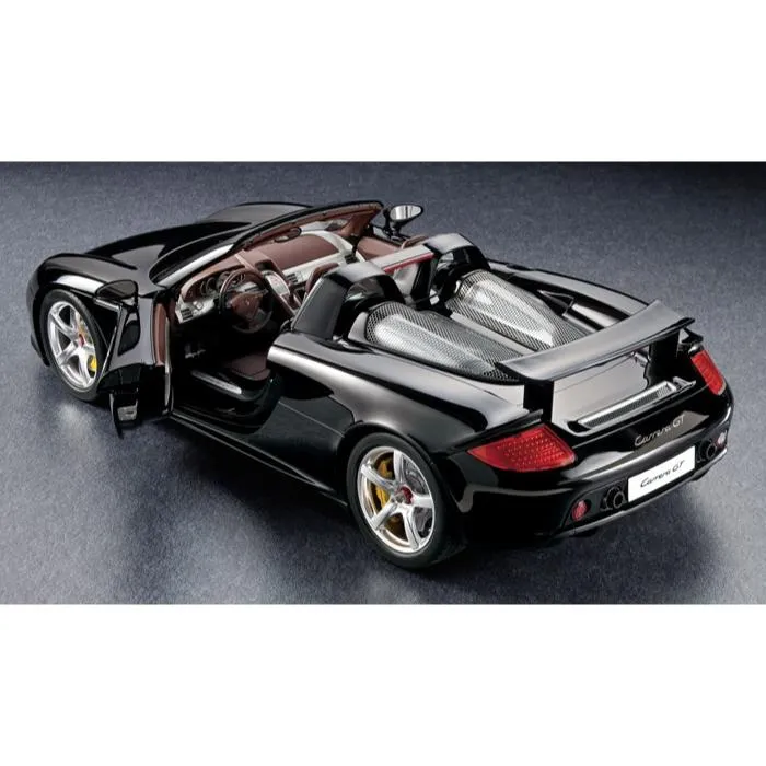 This is a 1/12 scale premium assembly model kit of the Porsche Carrera GT. Assembly of the delicately curved body follows that of the full-size car. Durable die-cast suspension arms are combined with working dampers and stabilizers for real-action suspension. Metal-hinged doors, hood and rear cowl open realistically to display the fully detailed interior and V10 engine. The rear wing pops up to the extended position when the license plate is pressed, while the hard-top can be removed and stored under the hood to show off the convertible style of the Porsche.