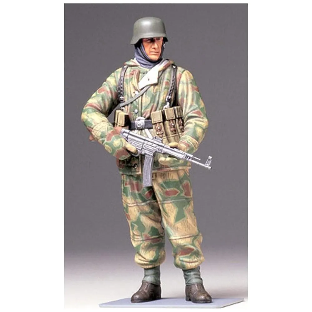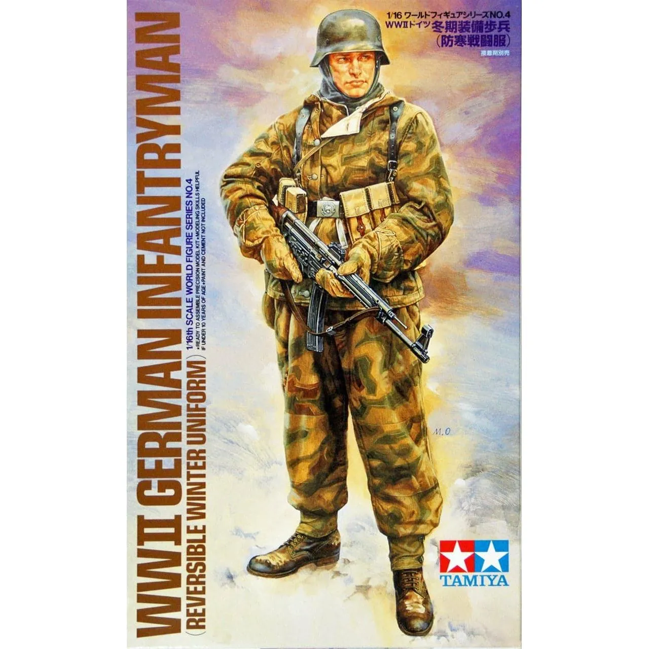 This is a 1/16 scale plastic figure assembly kit recreating a WWII German infantryman in reversible winter uniform. ★He is depicted in realistic pose with MP44 assault rifle in hand. ★Realistic facial expression and creases in clothing ensure a highly detailed finish. ★Depictions of ammo box, shovel, gas mask case and other accessories add a final accent to the model.