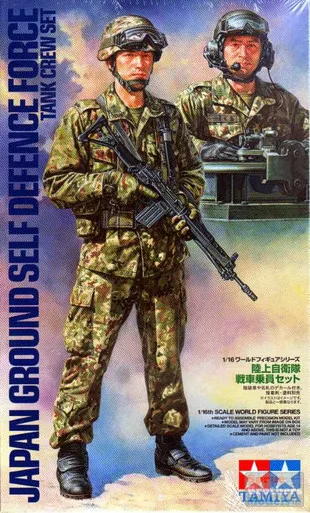 This is a plastic model assembly kit of Japan Ground Self Defense Force tank crewmen. ...The set features one full-body figure portraying a gunner with Type 89 rifle, plus a commander torso figure pictured surveying the scene in front of his vehicle.