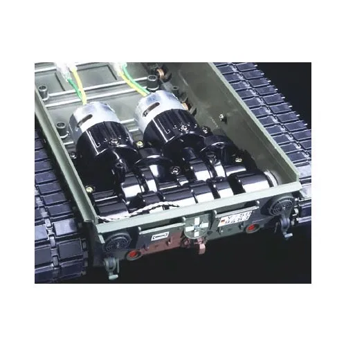 The front-mounted gearbox contains two Type 380 motors that can operate together or individually to produce forward/reverse running and pivot turning. Metal torsion bars and suspension arms combine with the wide tracks to smoothly absorb bumps and dips in the terrain and provide high maneuverability. In addition, realistic engine sounds accompany the tank as it starts up, drives, and stops to idle. Hull-mounted main gun can be elevated, depressed, and swung to the left and right.