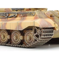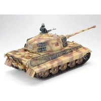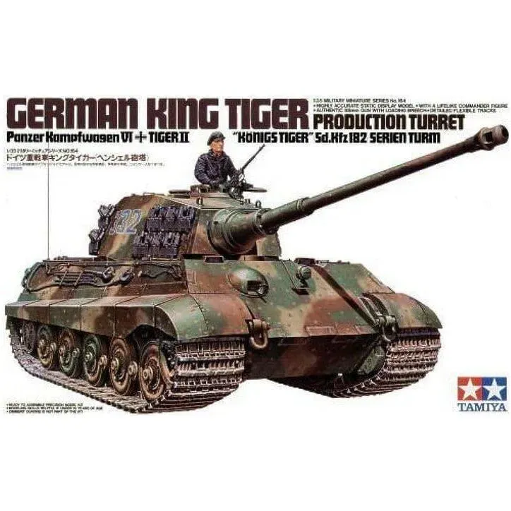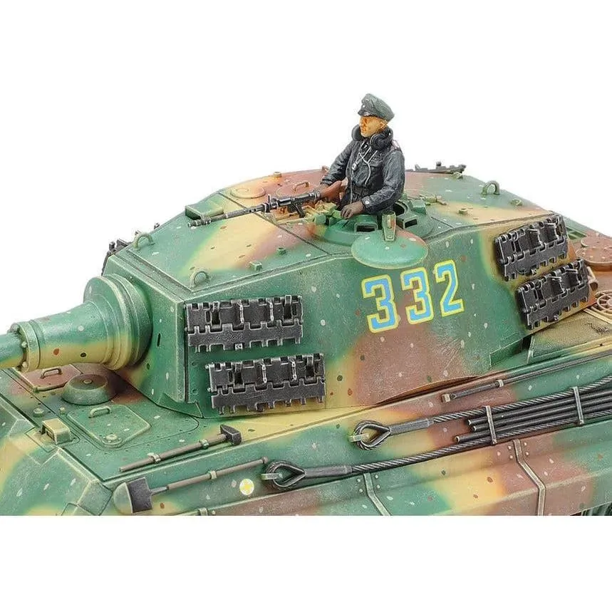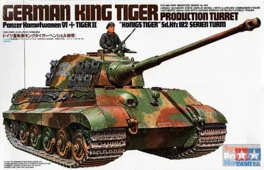 In order to counter the increasing threat of Russian tanks during the latter part of the Second World War, Germany began development of a new heavy tank in February 1943. Officially designated the Panzerkampfwagen VI-B Tiger II, but better known as the King Tiger, it featured thick armor and a powerful main gun. Henschel and Porsche, who had prior experiences in the manufacturing of heavy tanks, came up with rival prototypes incorporating different turret configurations. After trials, the Henschel design was adopted for production. The King Tiger carried the Type 43 L71, 88mm high velocity main gun which was capable of penetrating 170mm thick armor plate at a distance of 1000 meters. Auxiliary armament included two 7.92mm machine guns mounted on the front hull section and on the turret. The extremely thick armor on the turret front measured 185mm and 88mm on the side panels. Power for this massive tank was supplied by a Maybach HL230 P30 V-12 cylinder, liquid cooled engine, producing 700 horsepower. The King Tiger went into mass production at the Henschel factory beginning August 1944, following the delivery of the last Tiger I tanks. Although the tank possessed advanced technology and sophistication, only 430 units incorporating the Henschel turret came off the factory line, and less than 500 total were ever available for combat.