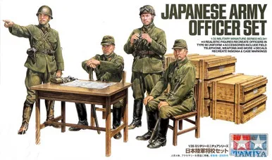So, What's Our Next Move? ★This realistic set contains 4 figures depicting Japanese Army Officers in a strategy meeting in the field. ★Two senior officers are seated and examining maps at a desk, with one tank and one infantry officer in standing pose. ★A multitude of parts recreates officers' swords, map pouch, binocular case and more. ★Features parts capturing desks and chairs, field telephones and case, telephone cable reel, radio and generator, plus infantry gun ammo cases. ★Decals are included to allow depicition of insignia and printed box markings. ★Instruction manual includes a scale cut-out map. ★Perfect for diorama use with such Japanese vehicle models as the Type 97 or Type 1.