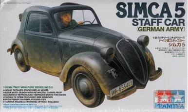 The Simca 5 was a small passenger car which debuted in March 1936. It was almost identical to the Fiat 500 Topolino as the car was actually designed by Fiat. The car was equipped with an independent front suspension, a 4-speed transmission, hydraulically-controlled drum brakes, and a 12-volt electrical system. At the time, the car was meant to be affordable for the French public, in the same way that the later Volkswagen Beetle and Fiat 500 brought inexpensive private motoring to the masses in Germany and Italy respectively. It was also very fuel efficient. Many were in use by the time WWII began, and the German Army captured large numbers of them when they occupied France. These were pressed into military service as staff cars for transporting personnel and liaison duties. Over 46,000 Simca 5s were built by the time production ended in 1946. The Tamiya model kit is an exact replica that can be built and detailed using Tamiya fine finishing supplies.