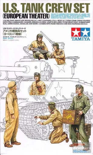Tankers Aplenty! ★This adaptable set of six 1/35 scale figures is perfect for use with Tamiya WWII U.S. tank models such as the M4A3E8 Sherman "Easy Eight" (European Theater). ★Figures feature highly realistic poses and depict soldiers in uniform typically used in the European Theater of WWII. ★The set includes 3 types of clear goggle parts (2 of each). ★Parts are included to authentically recreate accessories such as M3A1 submachine gun and 2 different types of ammunition box. ★Comes with decals depicting unit and rank insignia. ★Set contains 4 full body figures and 2 torso figures.