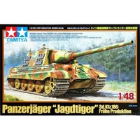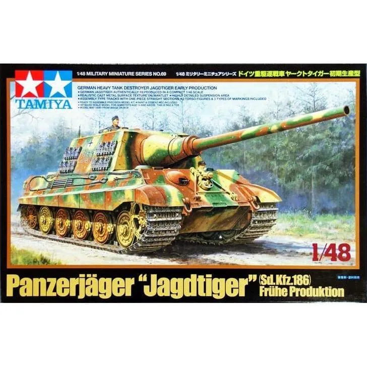 About the Model This is a 1/48 scale plastic assembly model kit. ★Length: 219mm, Model faithfully depicts the heavy weight of the tank. ★Giant-sized main gun and cast metal surface on the mantlet are realistically reproduced. ★Highly detailed suspension precisely rendered. ★Assembly type tracks with one-piece straight sections included. ★Commander and driver torso figures and three kinds of markings for Jagdtiger tanks from the 653rd Heavy Anti-Tank Battalion included.