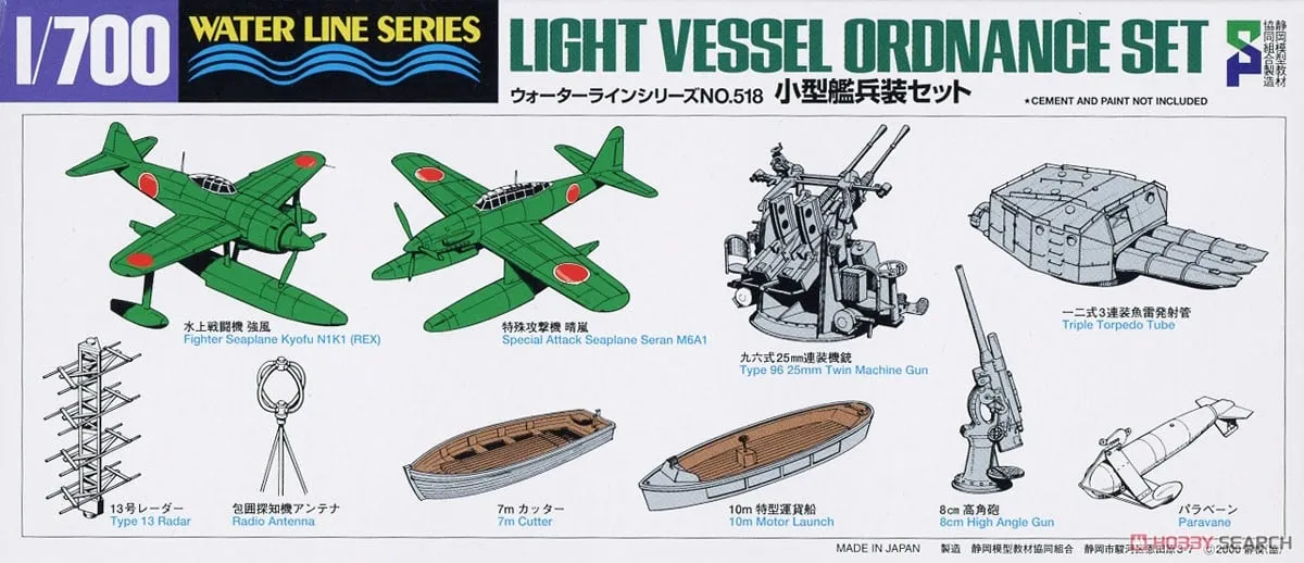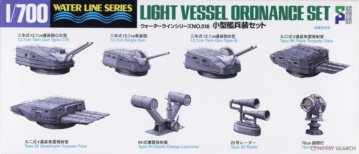 This accessory set depicts main guns, torpedo launchers, searchlights, and other equipment to add more detail to your WWII Japanese Navy destroyer, submarine, or other smaller vessel model.