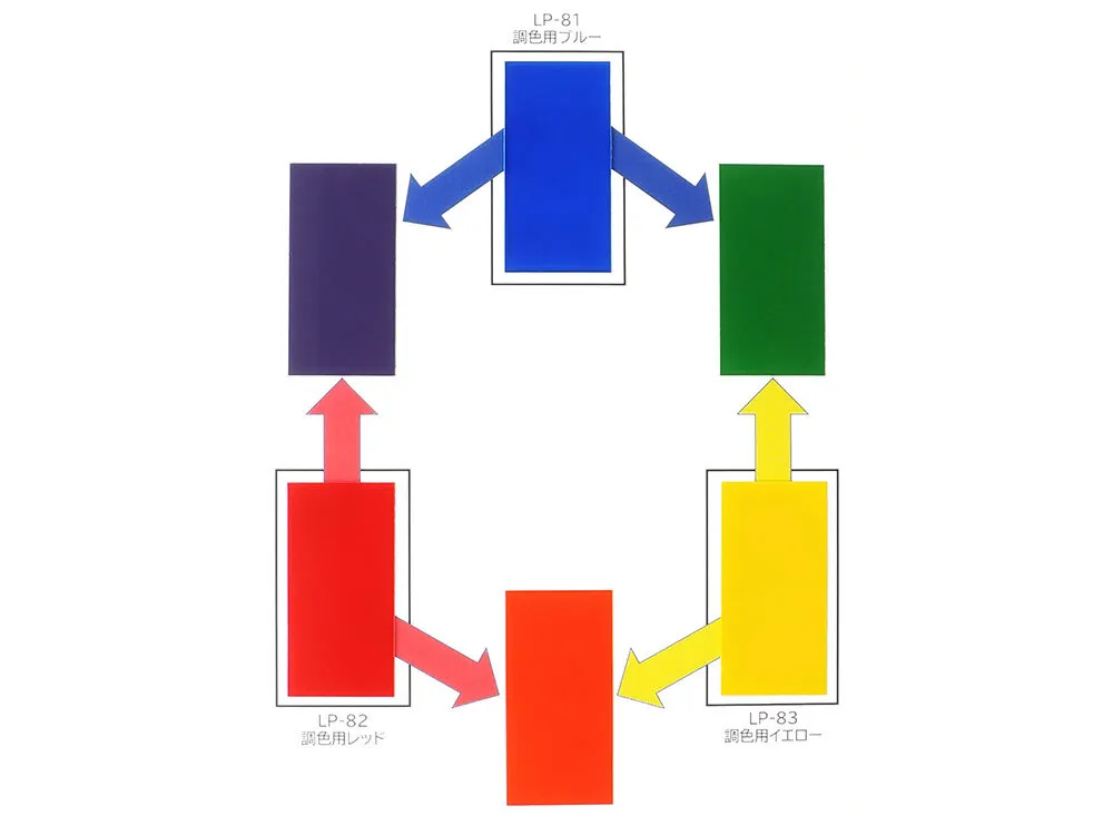 It causes minimal cloudiness when mixed, and is recommended for making your own custom hues. ★Use Tamiya Color lacquer thinner to thin or clean up. ★Please note that if used unmixed, it may experience bleeding through of the color underneath. ★Bottle contents: 10ml ★This shows various concentrations with LP-2 White. ★Check out the combination of LP-82 and LP-8 Pure yellow. (Effect varies with concentration of LP-82.) ★This image shows a combination of LP-81 and LP-41 Mica blue. (Effect varies with concentration of LP-82.) ★Compare the combination of LP-2 White and LP-7 Pure red (left) vs. LP-82 (right). (Effect varies with concentration of colors.) ★Three mixing colors were released simultaneously! ★This illustration shows the effects of combining various colors. RELATED PRODUCT