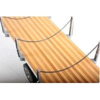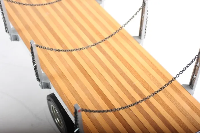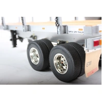 This highly realistic 1/14 scale flatbead semi-trailer model is for use in combination with Tamiya's 1/14 scale R/C tractor trucks. A scale appearance is achieved by using authentic components such as aluminum chassis/frame, wood-floored platform and actual chains.