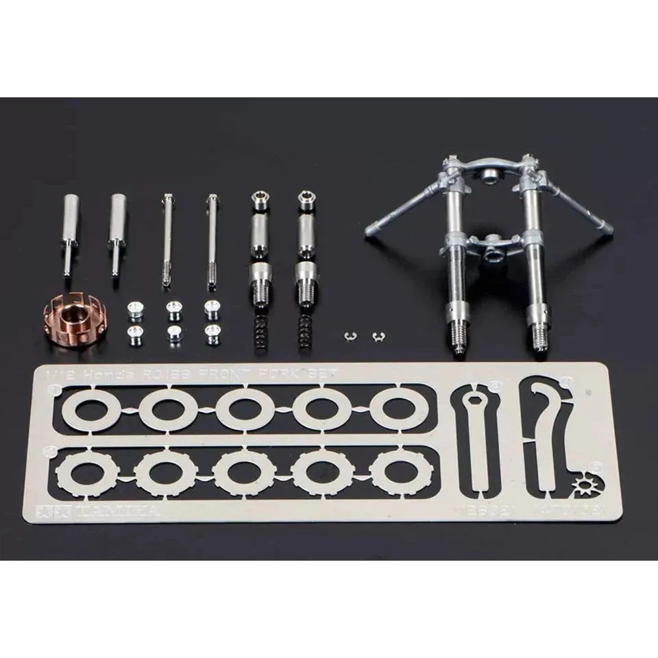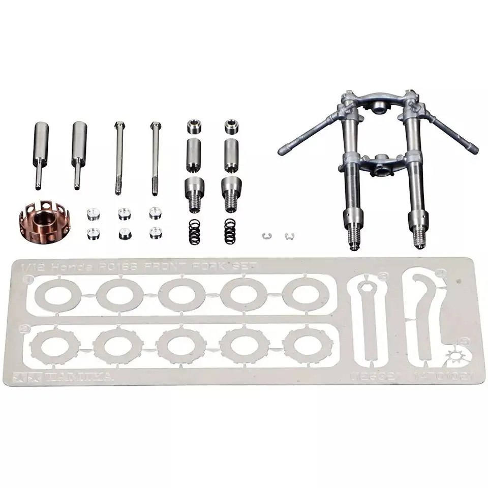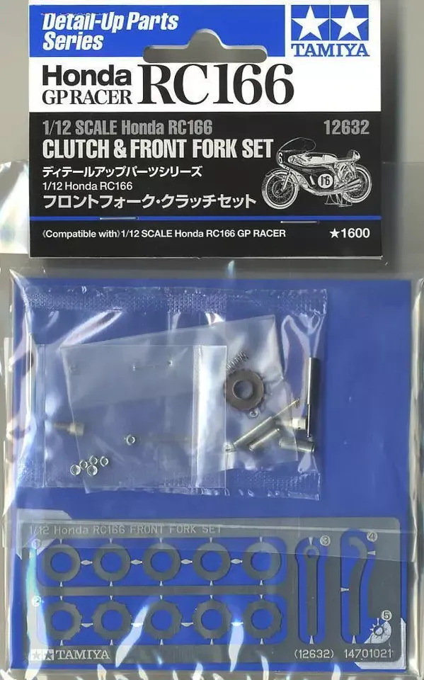 About the Set ★A whole extra world of detail for your 1/12 RC166 awaits with this set of clutch and front fork components. ★Includes stainless steel fork inner tubes, with 1.4mm hex bolts for a cement-free assembly. ★Aluminum clutch case, air funnels and outer tubes, plus photo-etched parts are also included. RELATED PRODUCTS Static Models ITEM 14113 1/12 HONDA RC166 GP RACER Static Models ITEM 12631 1/12 SCALE Honda RC166 WHEEL SET Static Models ITEM 12633 1/12 SCALE Honda RC166 METAL CHAIN SET Static Models ITEM 12634 1/12 SCALE Honda RC166 RIVET SET Information is current as of November 6, 2009.